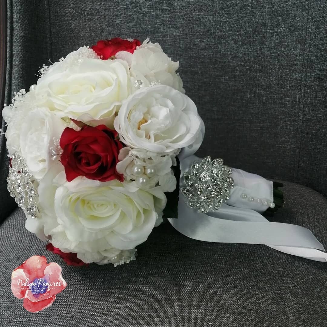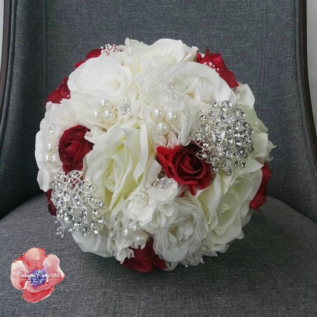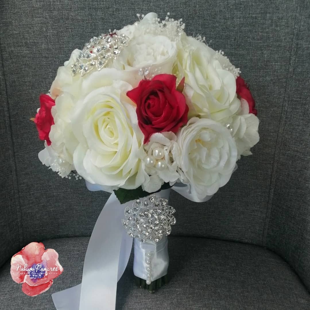 Ramo de novia artificial con pedrería y perlas. Hermoso. Lo enviamos a toda la República. Incluye bottoniere del novio.