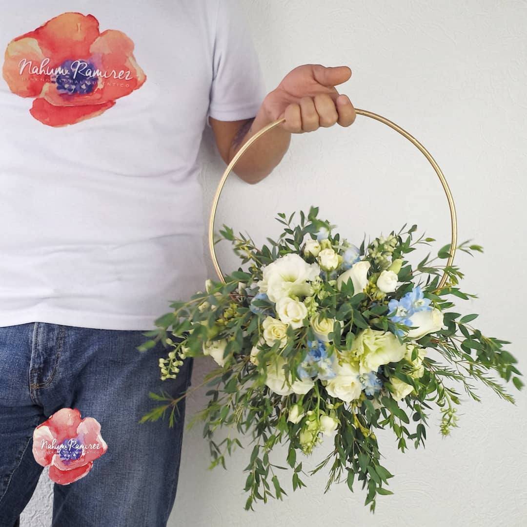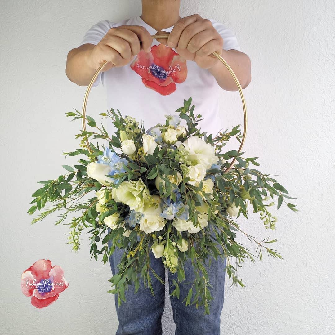 Hermoso ramo de novia en forma de flower hoop en colores blancos y azul. Los aros son de metal en color dorado.