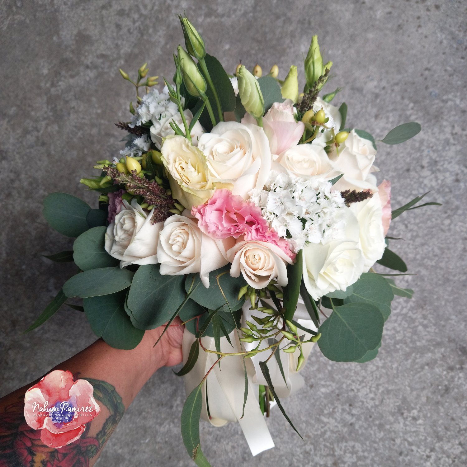 Ramo de novia natural con rosas y lisianthus. Incluye bottoniere del novio. En ramos naturales hacemos envíos a domicilio a CDMX y Área Metropolitana.