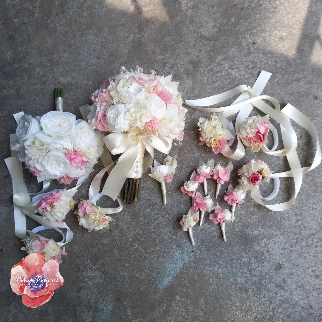 El paquete incluye un ramo de novia rehidratado, un ramo de aventar en artificial, 6 pulseras de dama, 7 bottonieres artificialesde bestman y el bottoniere rehidratado del novio