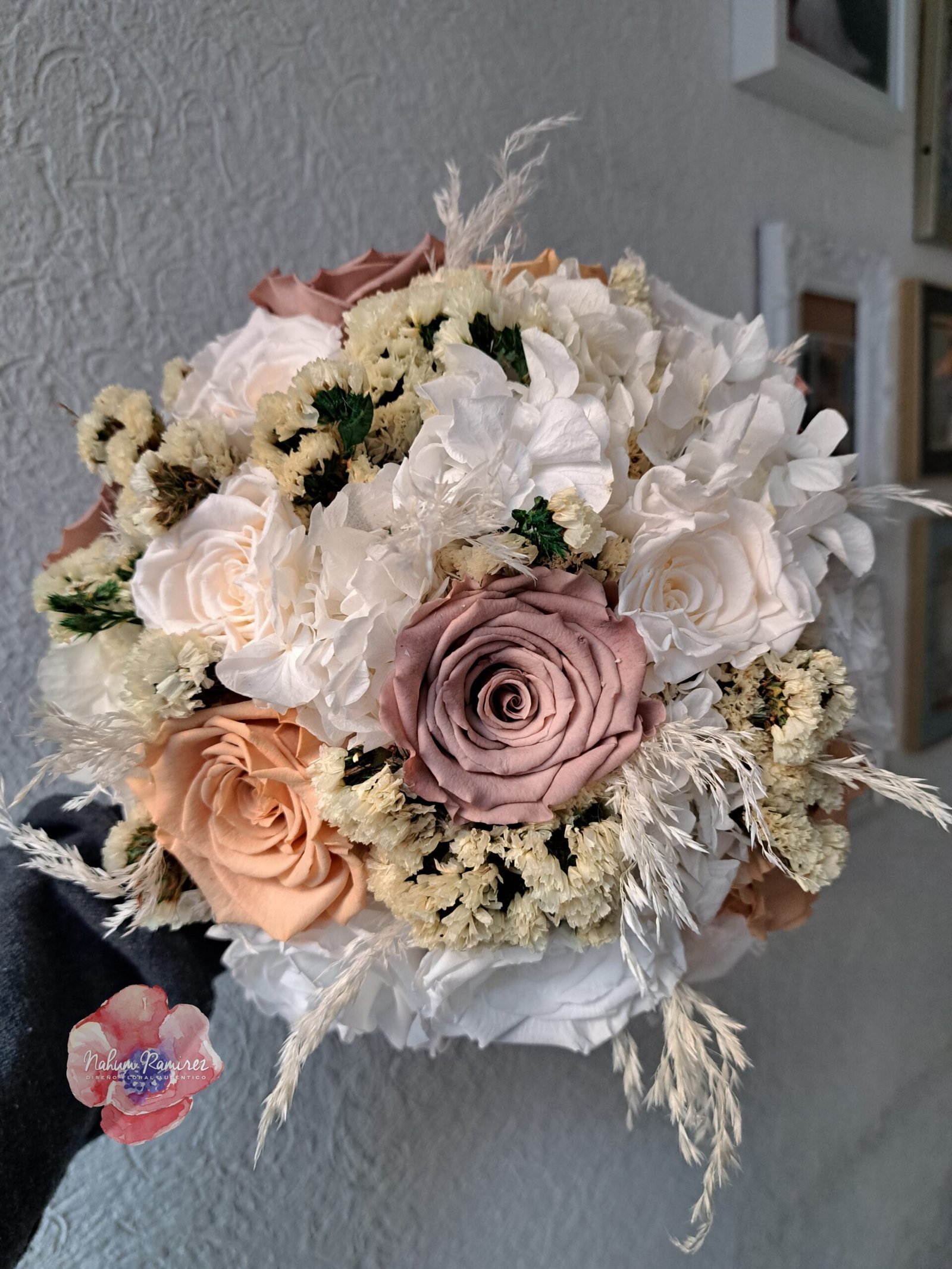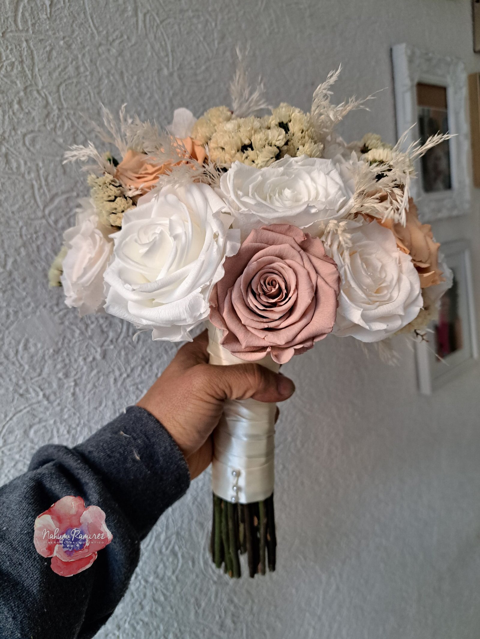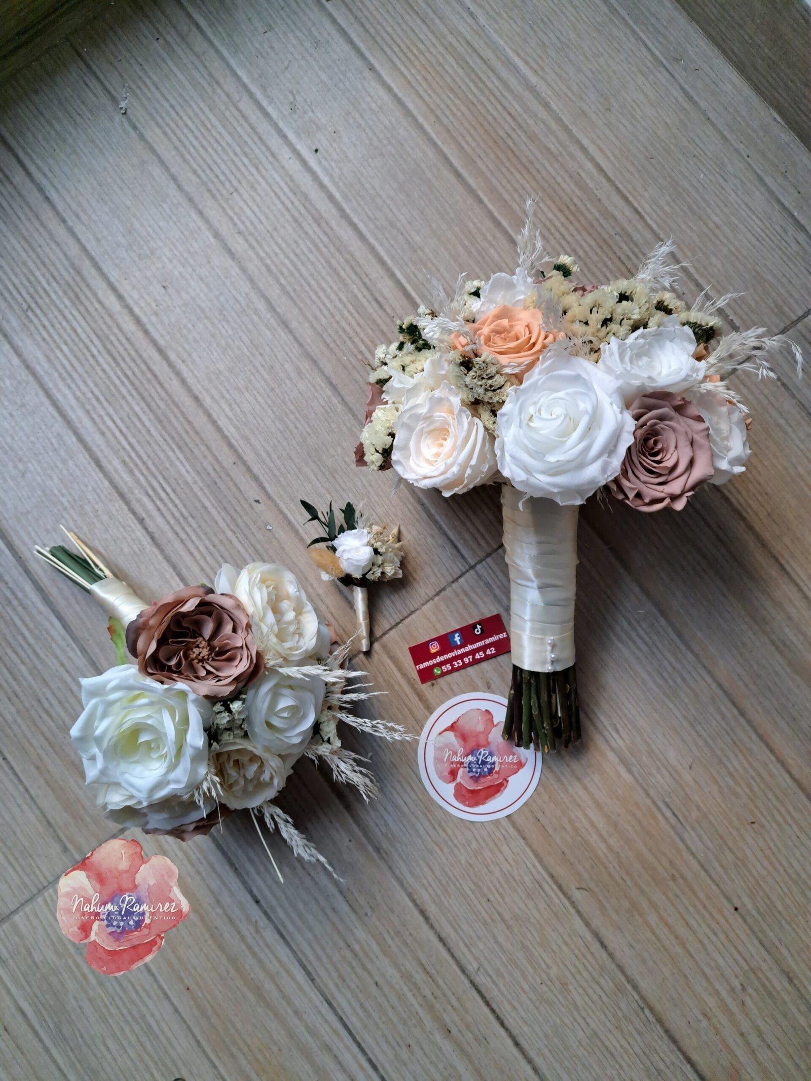Paquete de ramos de novia, el principal es preservado, el de aventar es artificial y el bottoniere preservado.