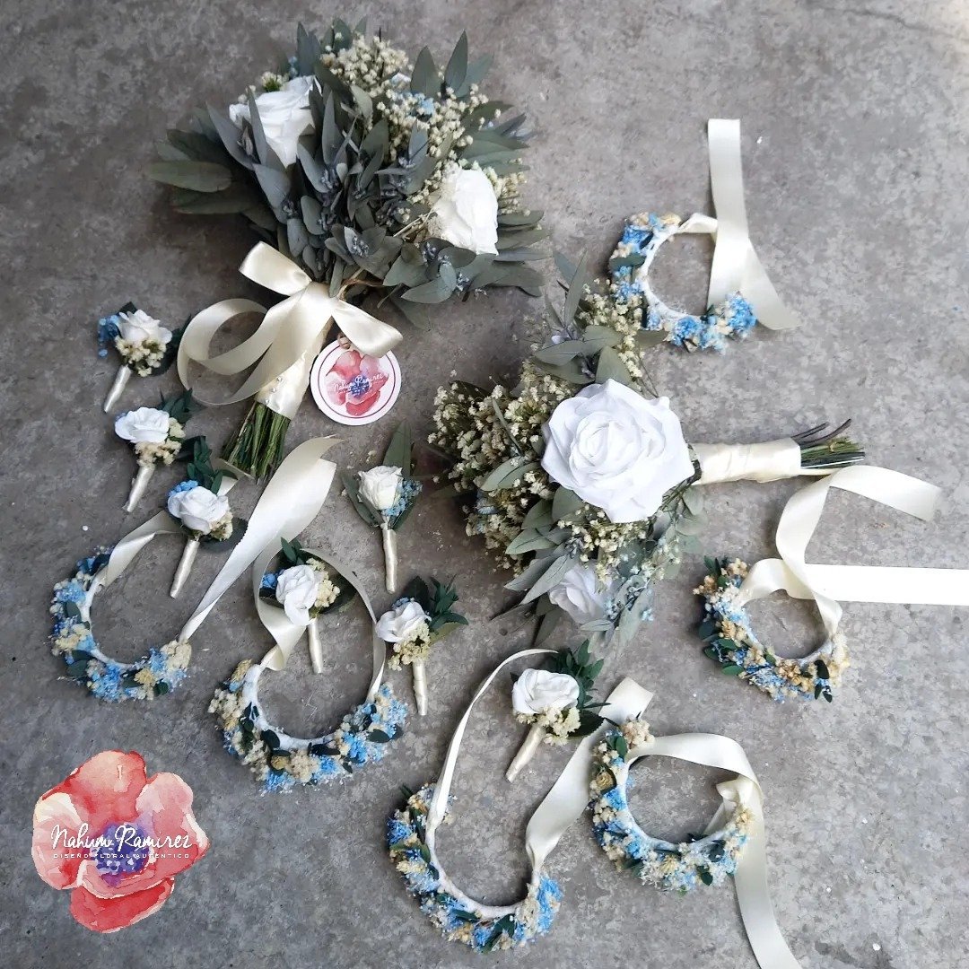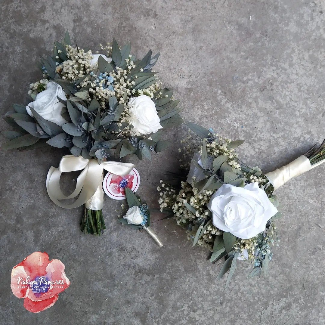 Paquete de ramos de novia rehidratado. El principal es rehidratado y el de aventar solo las rosas son artificiales. Lleva 6 pulseras 6 bottonieres