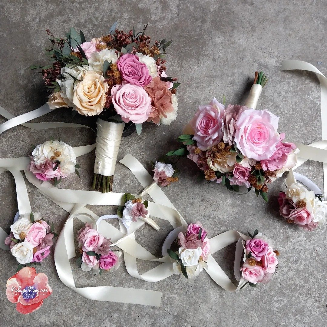 Psaquete que incluye ramo principal rehidratado, ramo de aventar artificial, 6 pulseras y un bottoniere rehidratado