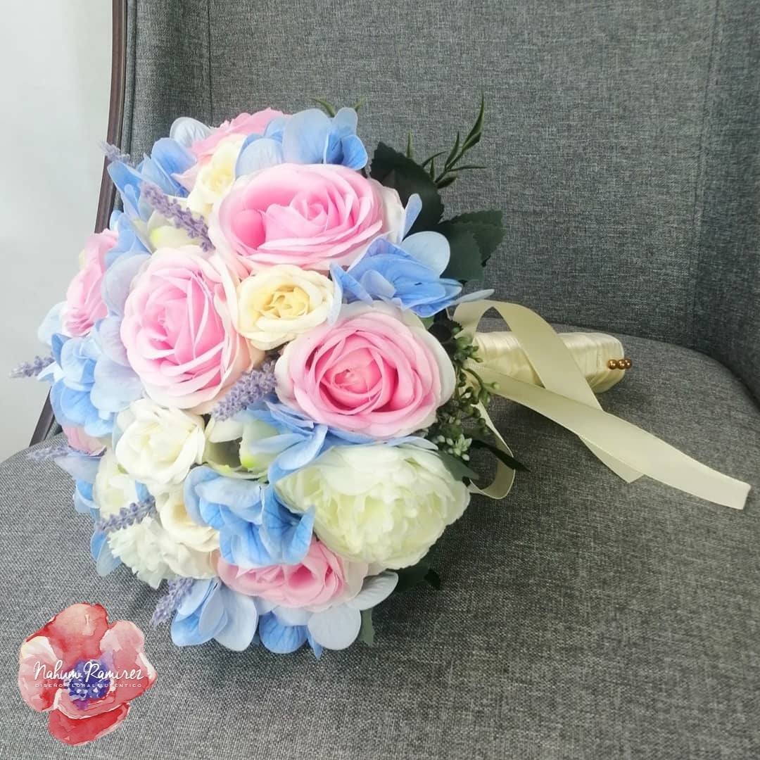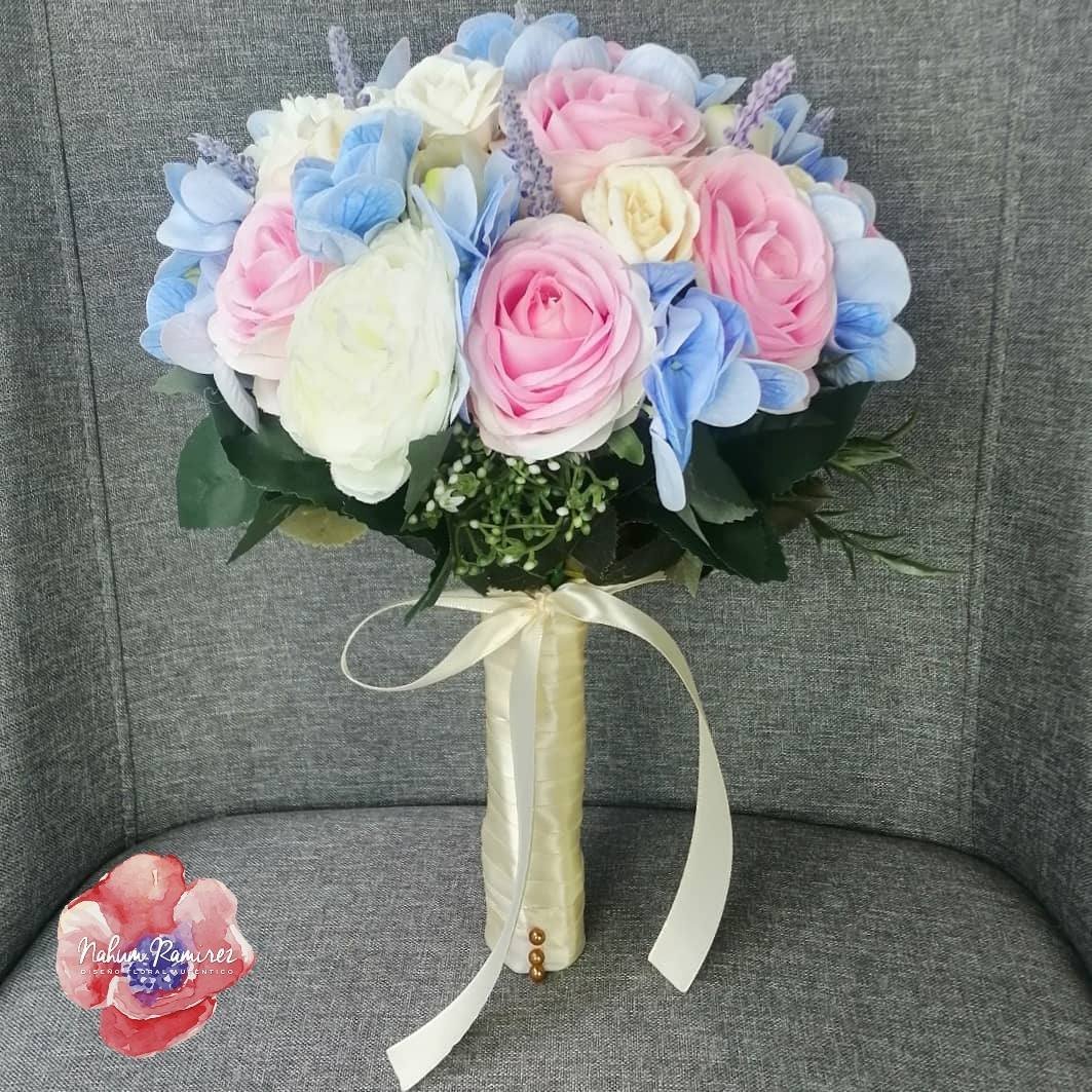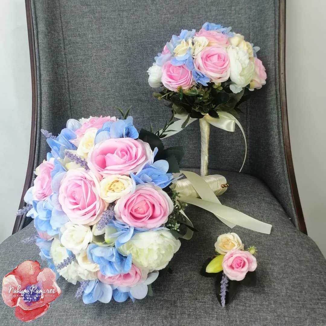 Paquete de ramos de novia con ramo principal, un ramo de aventar del mismo estilo que el principal pero más pequeño y bottoniere del novio. Todo 100% artificial con rosas, hortensias, minirosas, rosa inglesa y tulipanes.