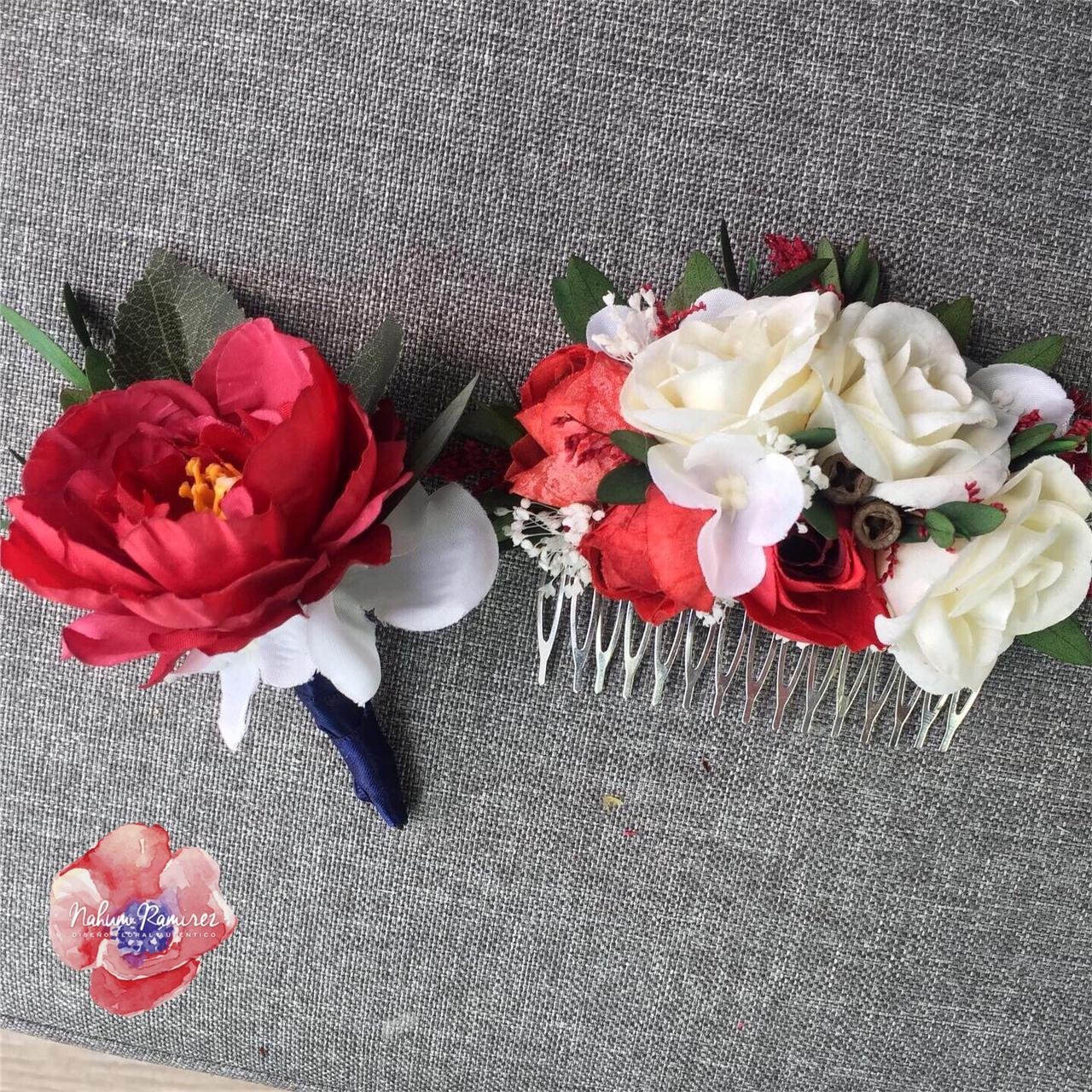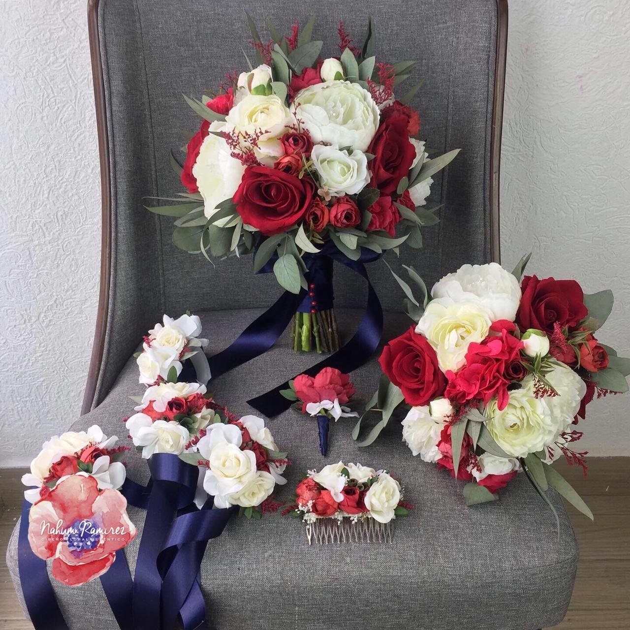 Paquete de ramos de novia; ramo principal, ramo de aventar, tocado floral, bottoniere my 4 pulseras artificiales. Enviamos a toda la República y a Estados Unidos Centro y Sudamerica