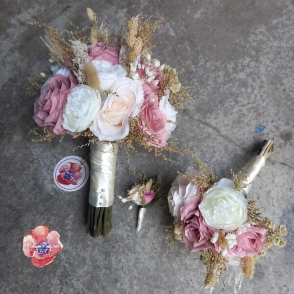 Paquete de ramos de novia artificial tonos ivory y palo de rosa