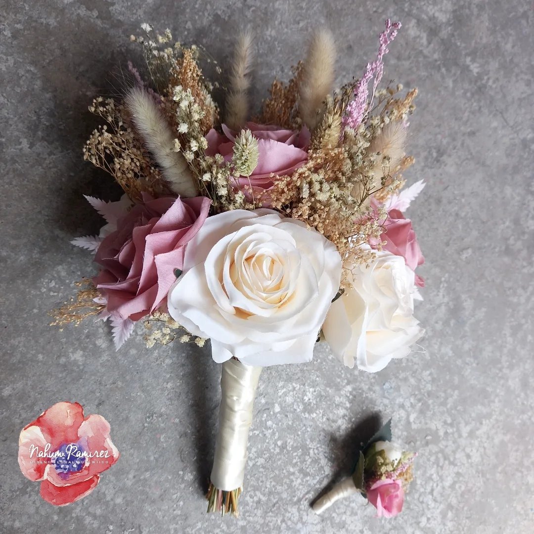 Ramo principal, ramo de aventar y bottoniere con flores artificiales y follaje rehidratado