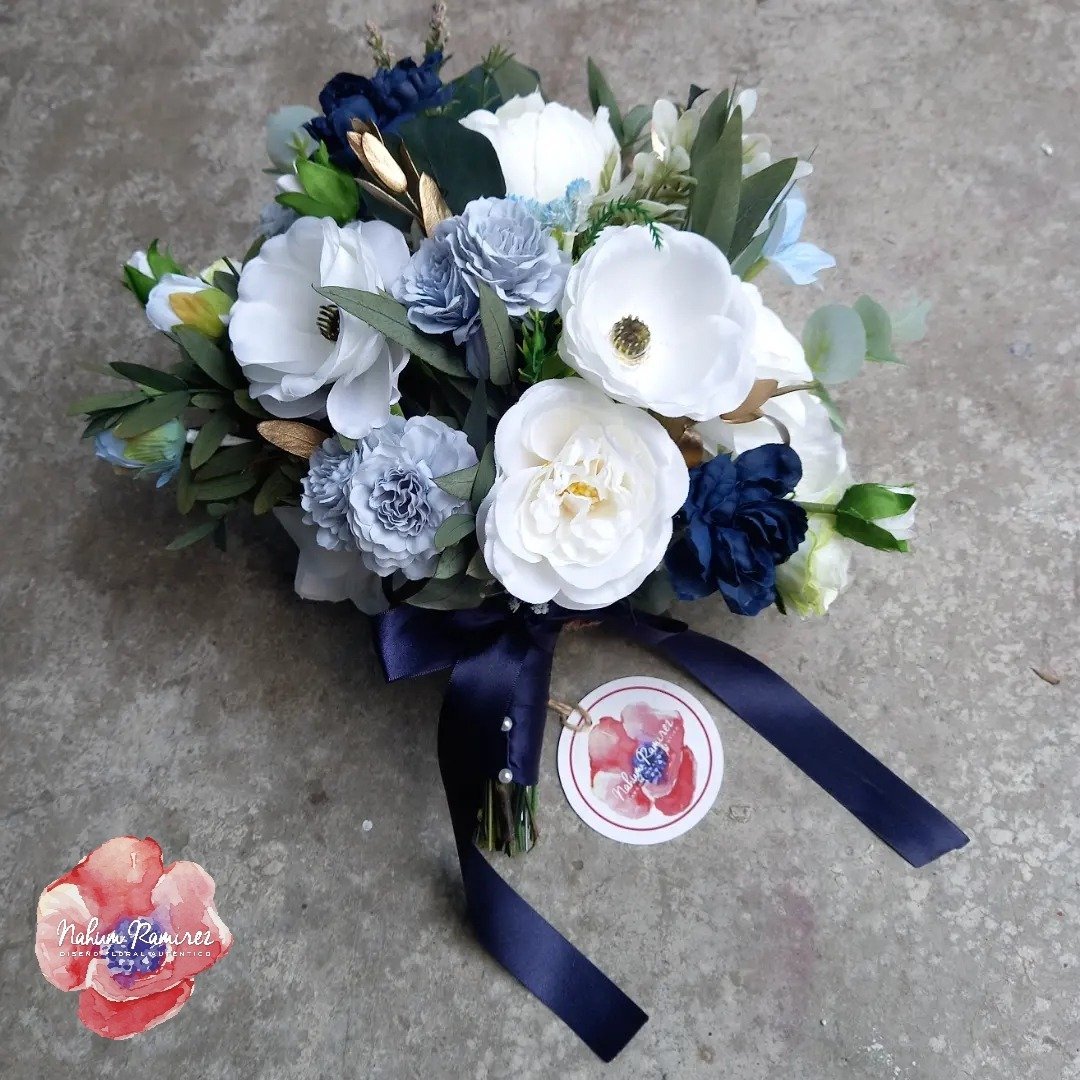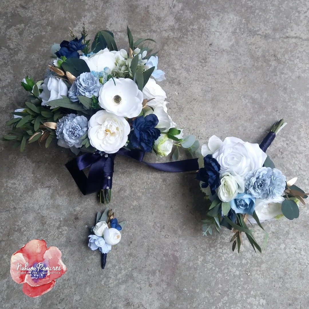 Paquete de ramos de novia en azul, blanco y dorado
