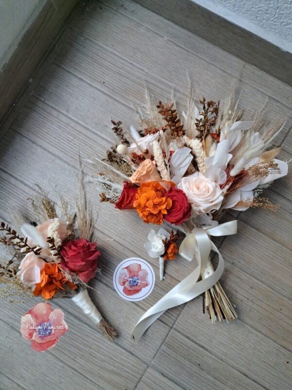 Paquete de ramos de novia preservado en colores terracota y naranja. Envíos a toda la República.