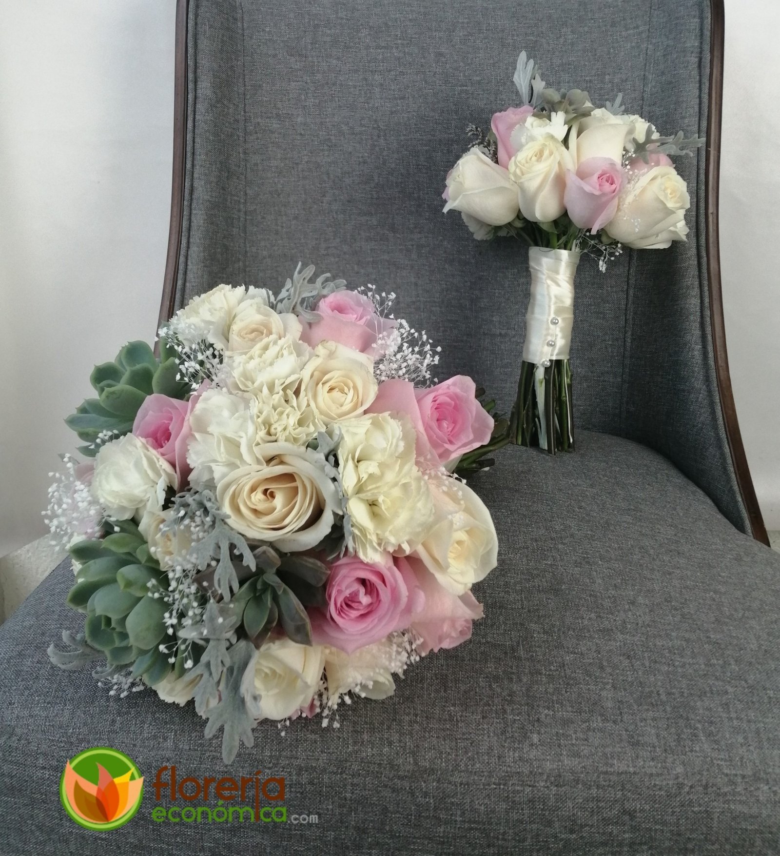 Paquete de ramo de novia principal y ramo de aventar. Incluye también el bottoniere del novio. NO INCLUYE ENVÍO A DOMICILIO.