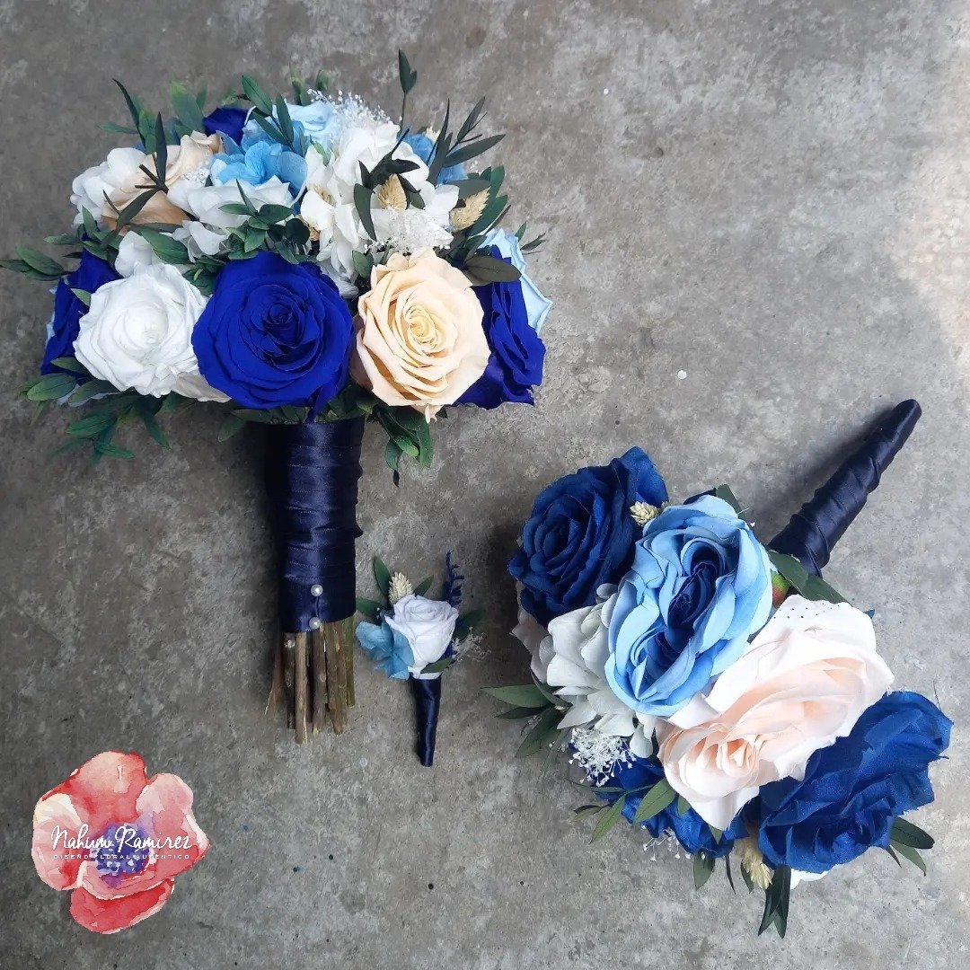 Paquete de ramos de novia, el principal es rehidratado y el de aventar esz artificial. Incluye bottoniere