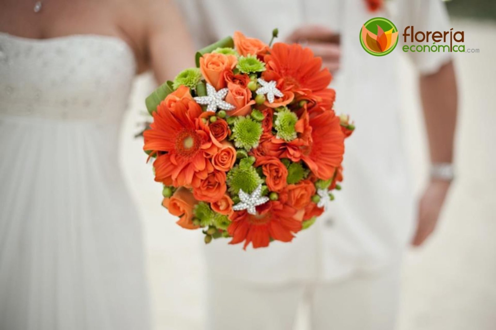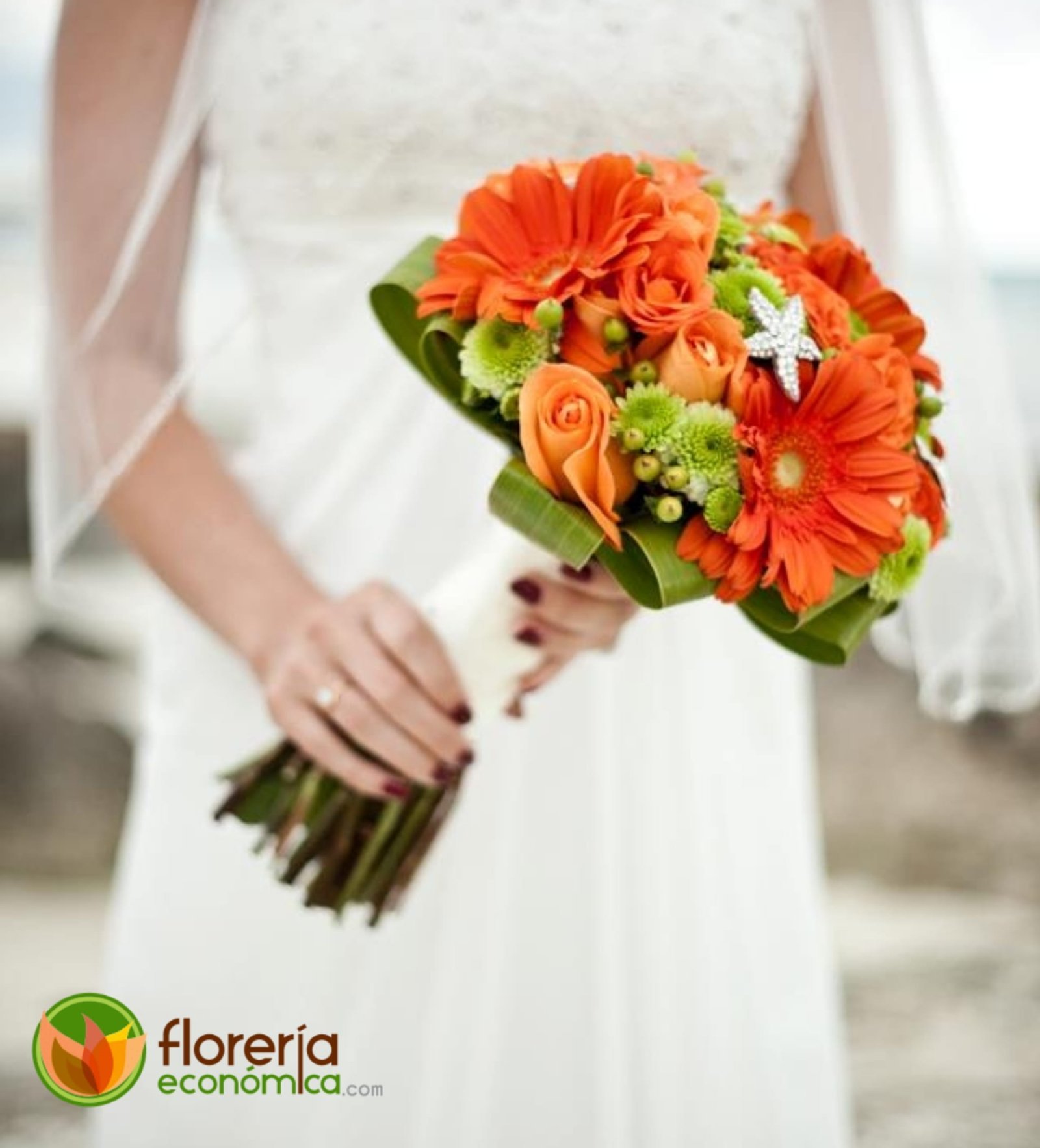 Ramo de novia con gerberas naranjas, minirosa naranja y rosas. Pregunta por nuestros paquetes y el envío a domicilio. No incluye bisuterías.