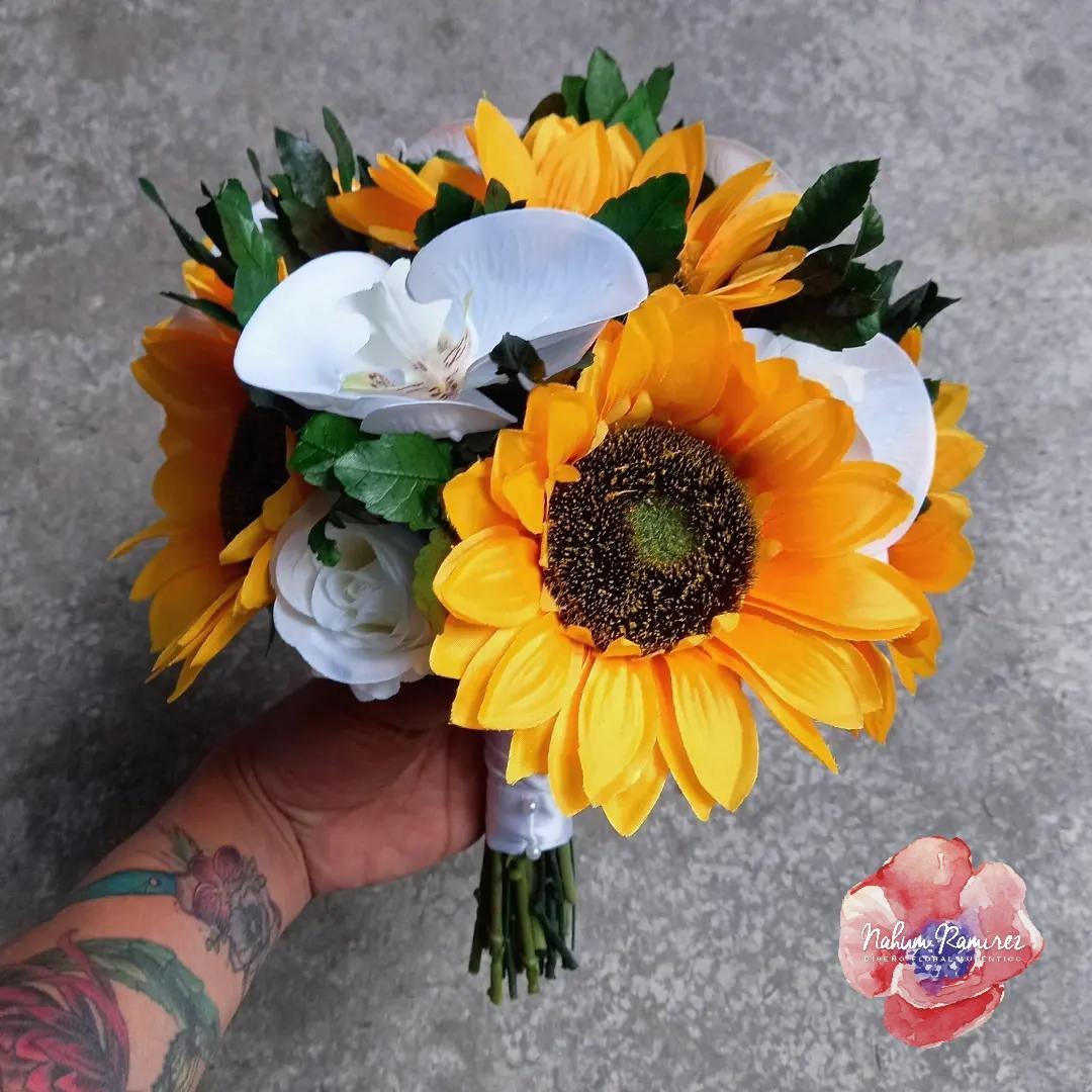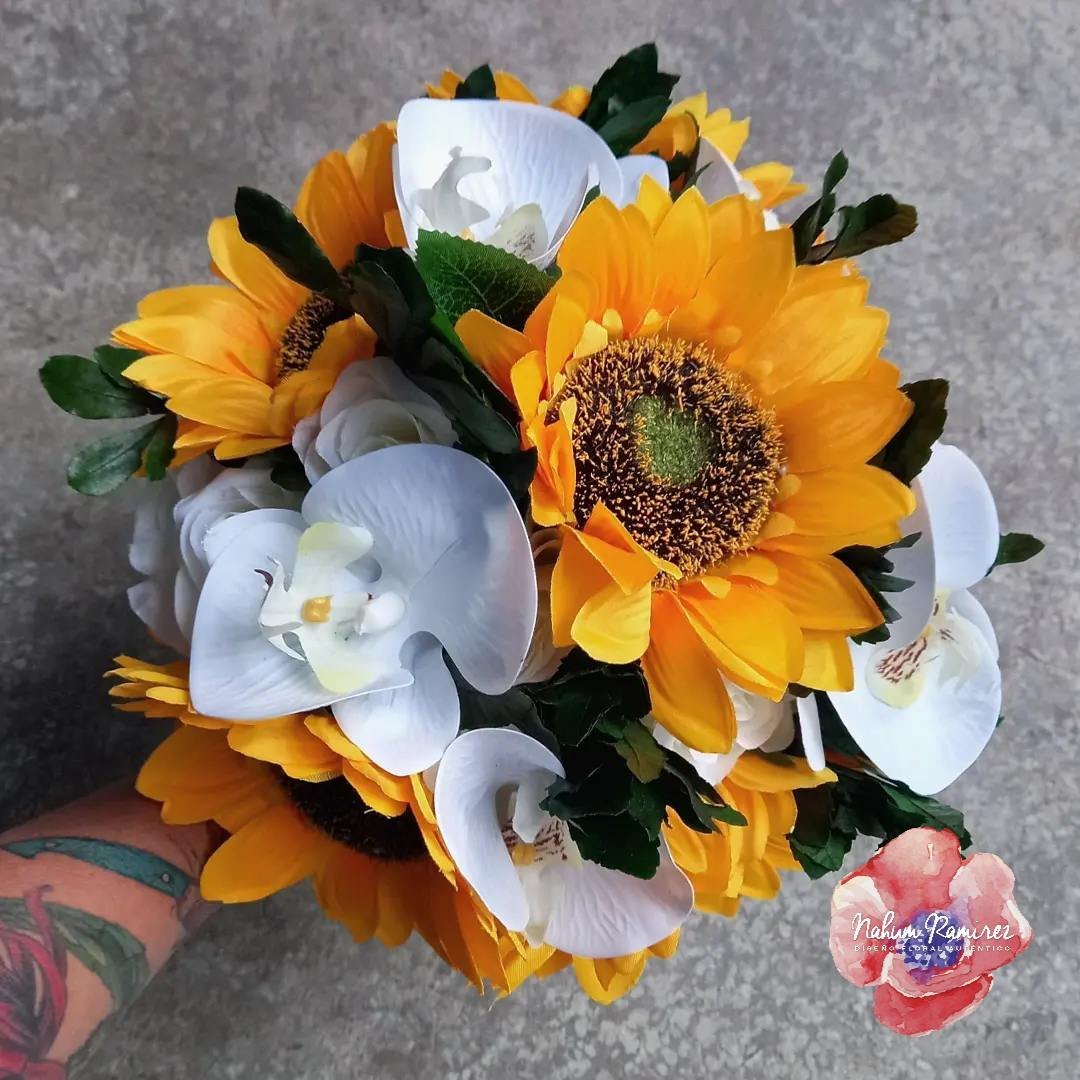 Ramo de novia artificial con girasoles, orquídeas y follaje rehidratado.Envíamos a toda la República.
