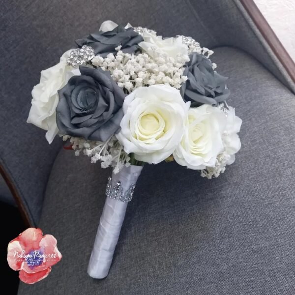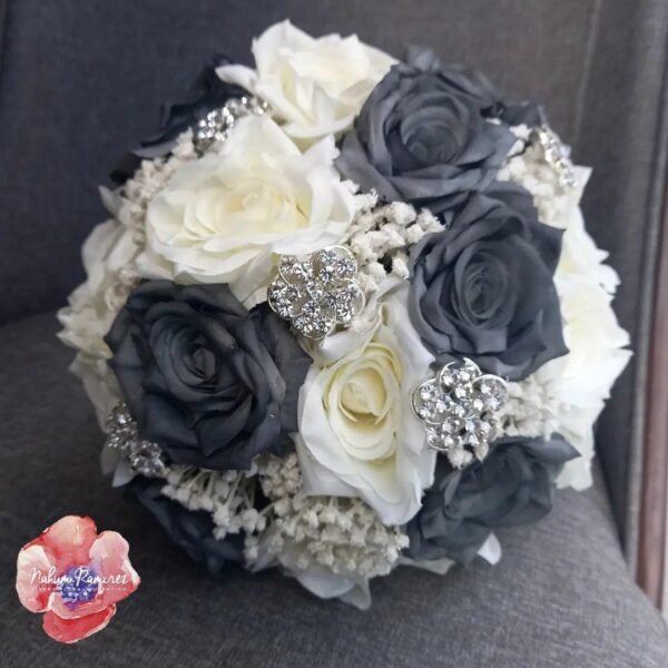 Hermoso ramo de novia artificial en tonos grises y blancos. Envíos a toda la República. Incluye bottoniere del novio.