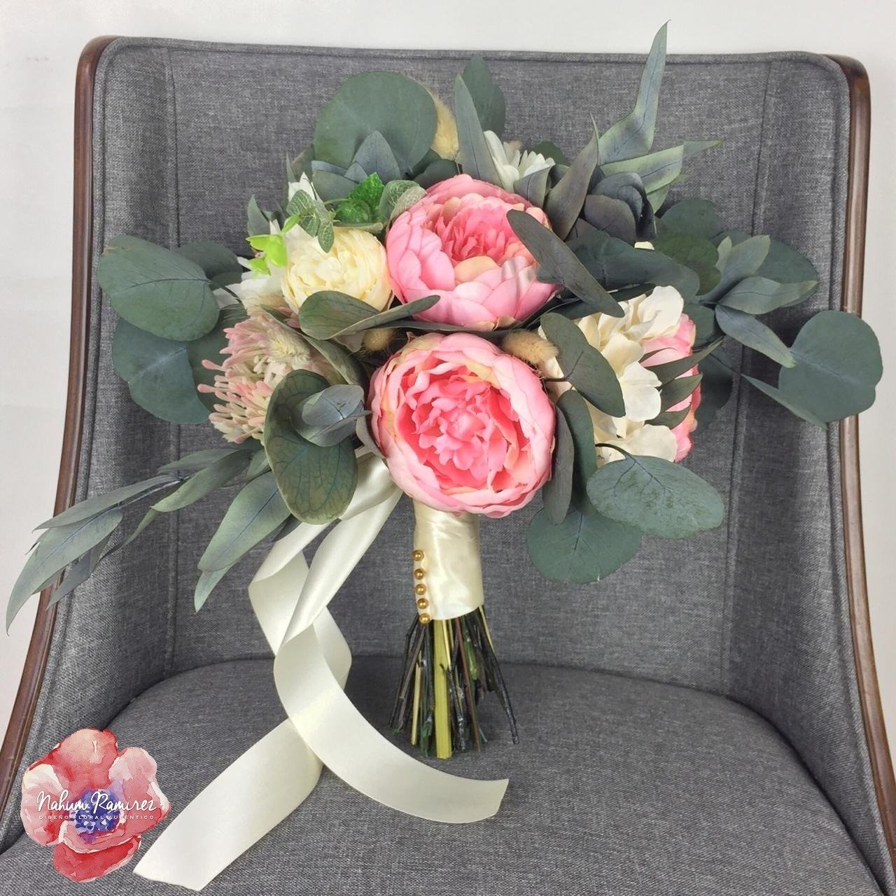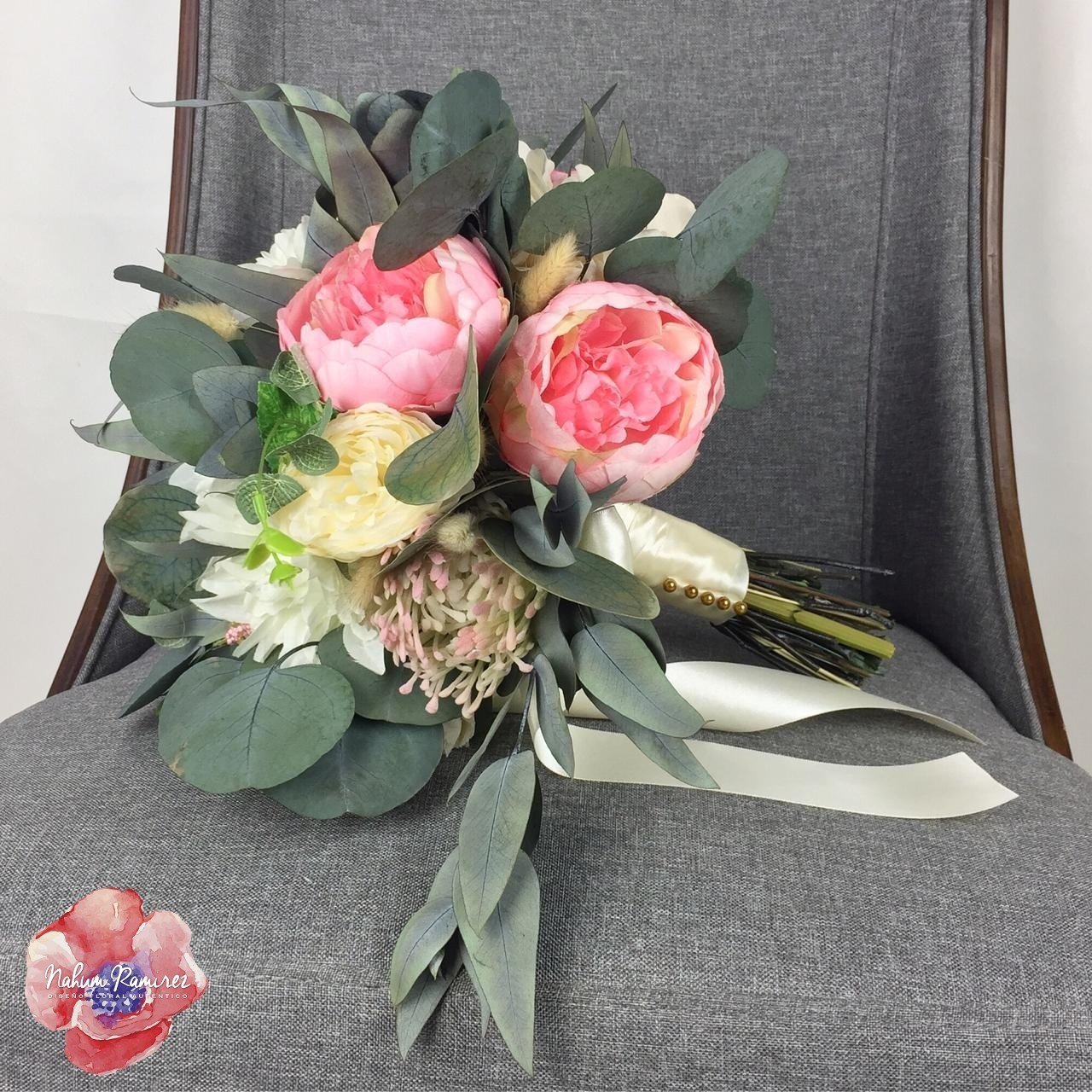 Ramo de novia artificial con peonias rosas, dalias blancas, proteas y rosa inglesa. También lleva follaje como eucalipto de dos tipos. Herrmoso!