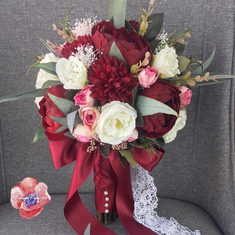 Hermoso ramo de novia con flores artificiales. De igual forma, este ramo está hecho con peonias color vino, clavel vino minirosas rosas y rosa inglesa blanca. Lleva follaje rehidratado. También hacemos envíos a toda la República.