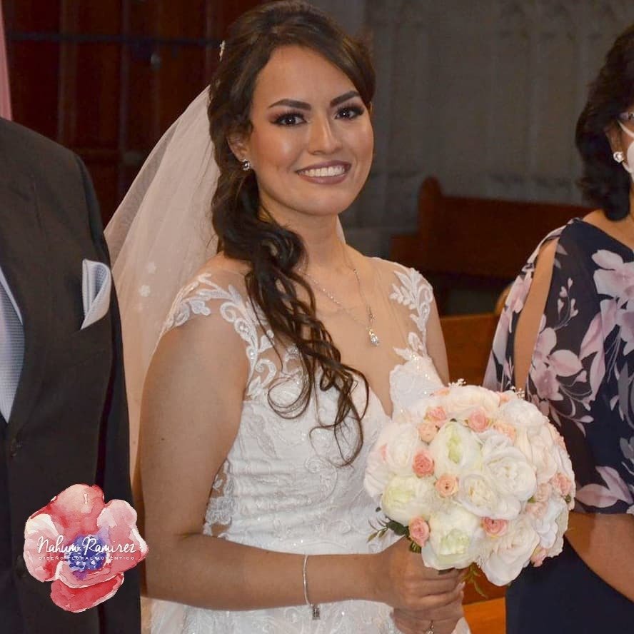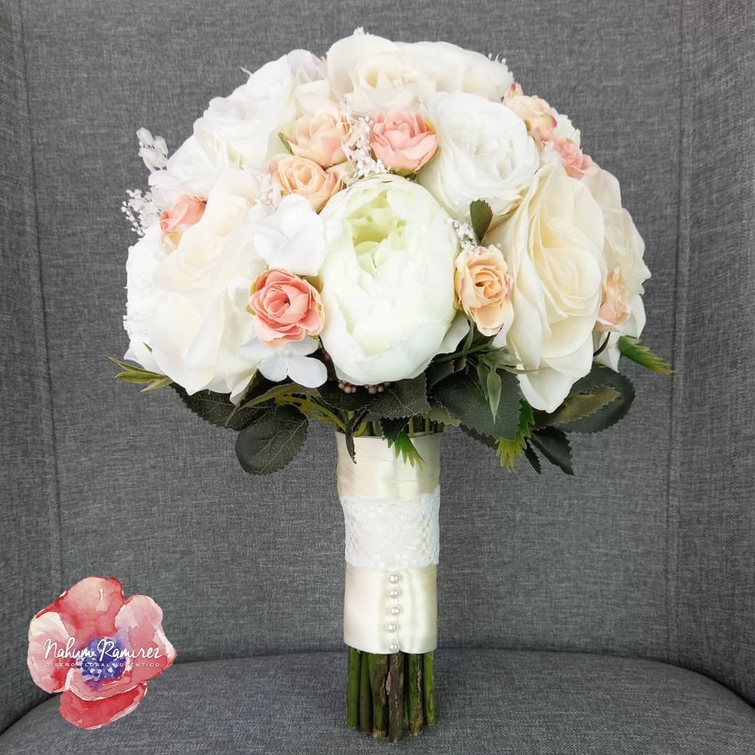 Ramo de novia artificial con peonias blancas y minirosas rosas. Incluye bottoniere del novio. Hacemos envíos a toda la República.