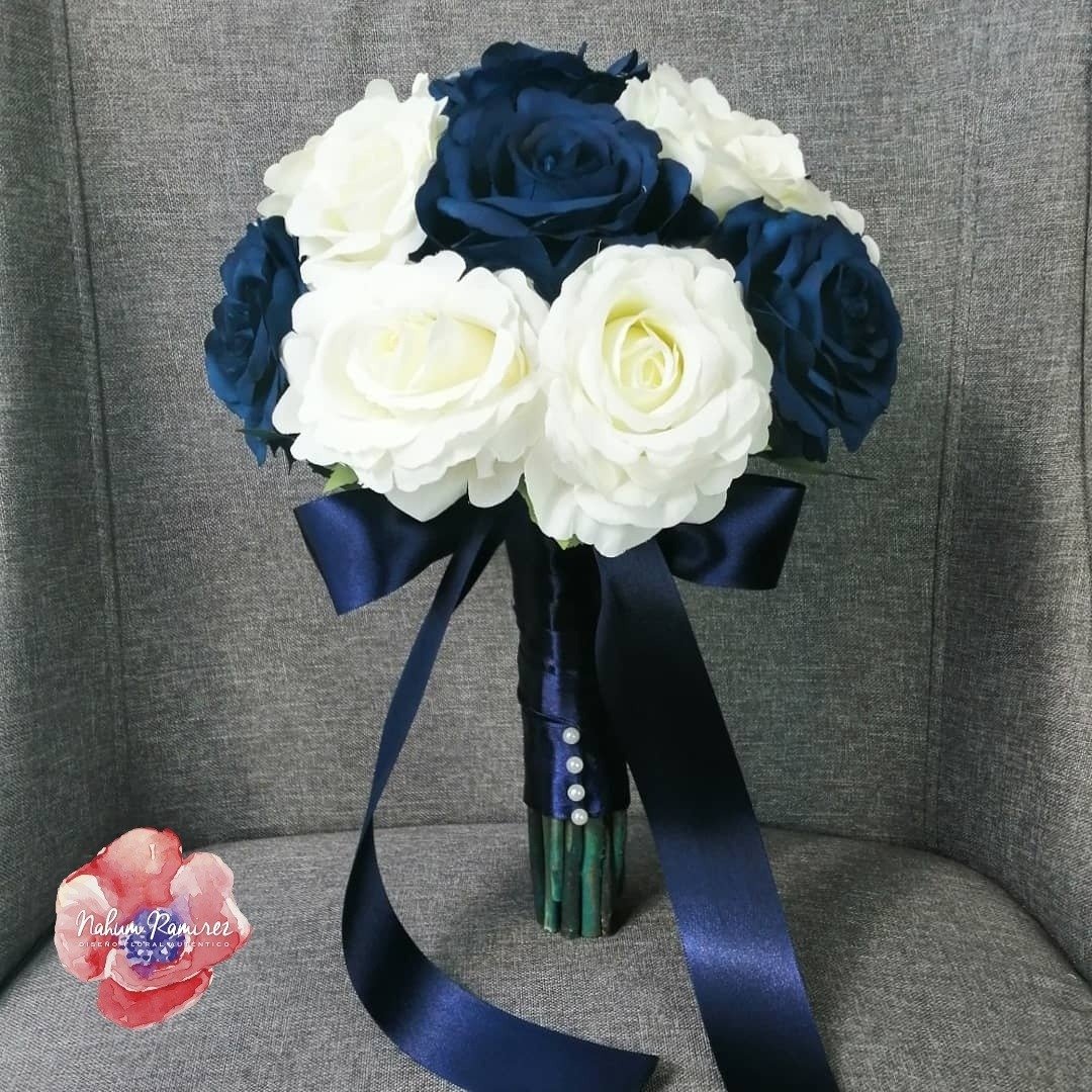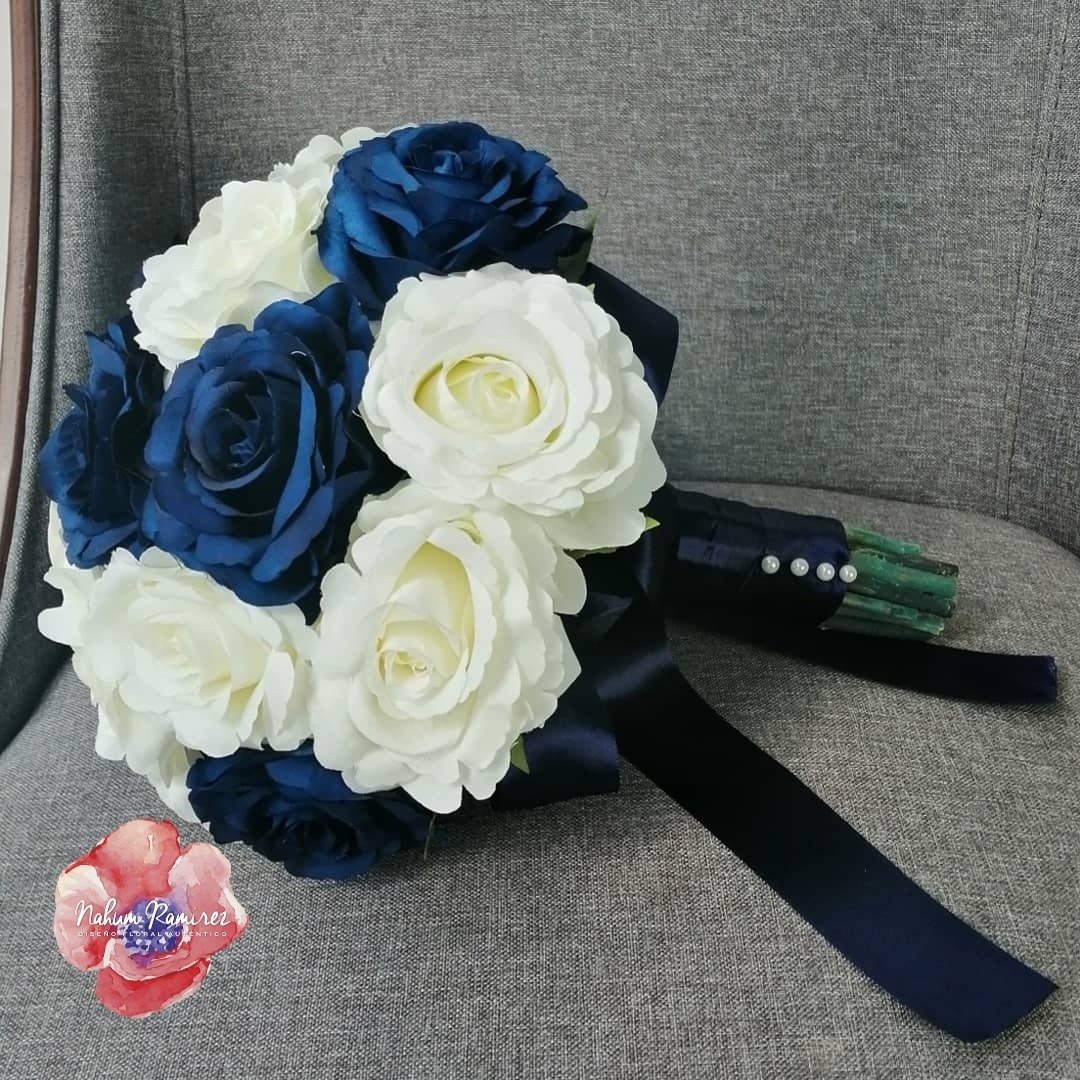 Ramo de novia artificial de rosas azules y blancas