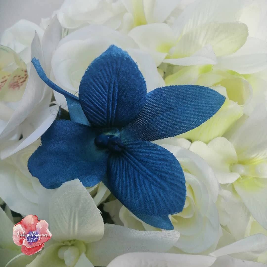 Ramo de novia artificial con orquídeas de dos tipos, rosas blancas y hortensias blancas.