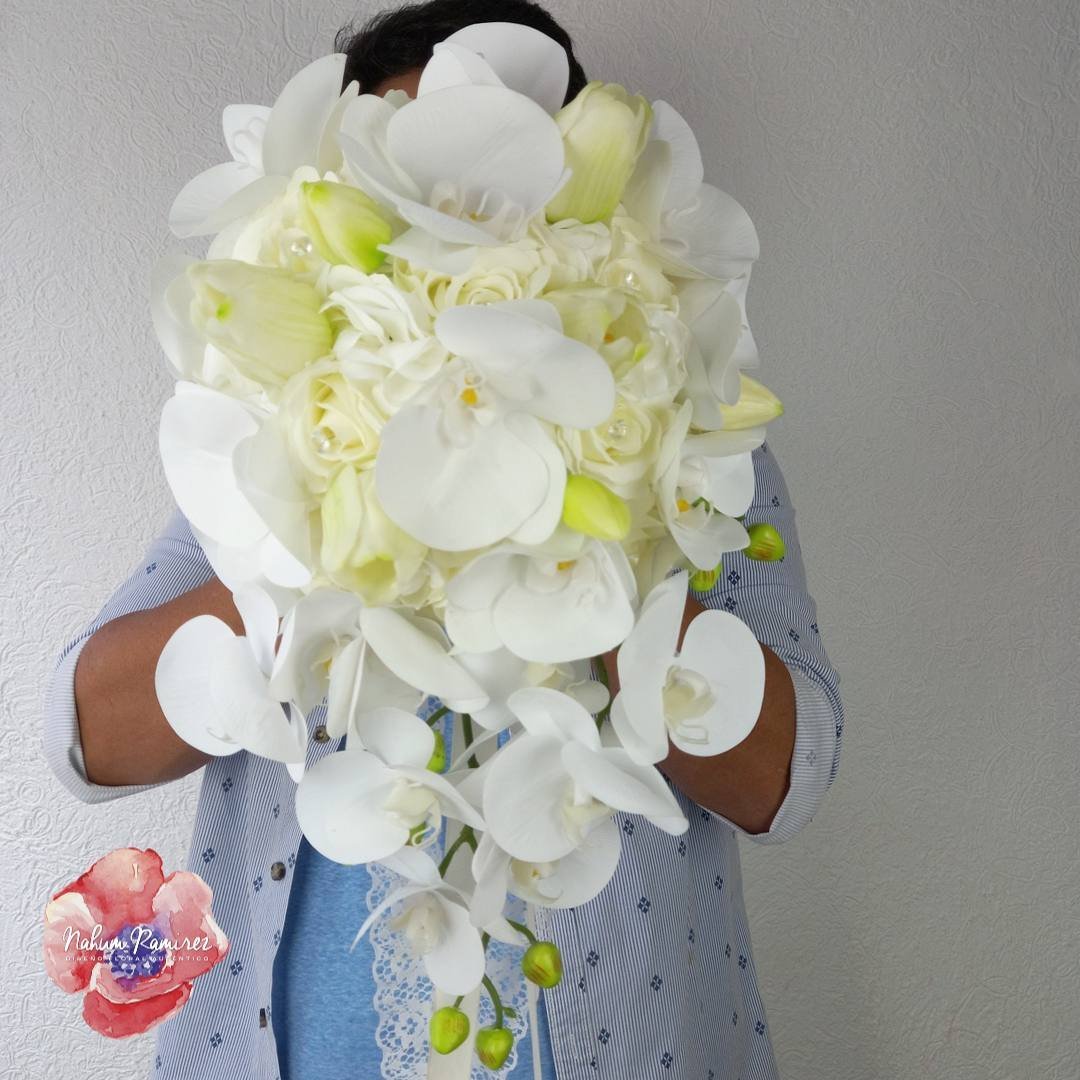 Ramo de novia en cascada artificial con rosas, orquideas y tulipanes. Además incluye bottoniere. Enviamos a toda la República. De igual forma, las flores son importadas y tipo tacto real.