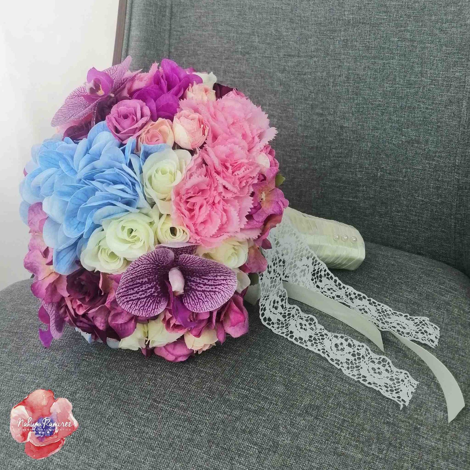 Aquí tenemos este hermoso ramo de novia artificial en tonos pastel, el cual lo hicimos con hortensias en varios tonos; minirosa en colores rosa, fucsia y morado; rosa blanca y tres orquídeas. ¿Qué tal? ¡Es muy hermoso! Además, este ramo te lo envíamos por paquetería a cualquier parte de la República.