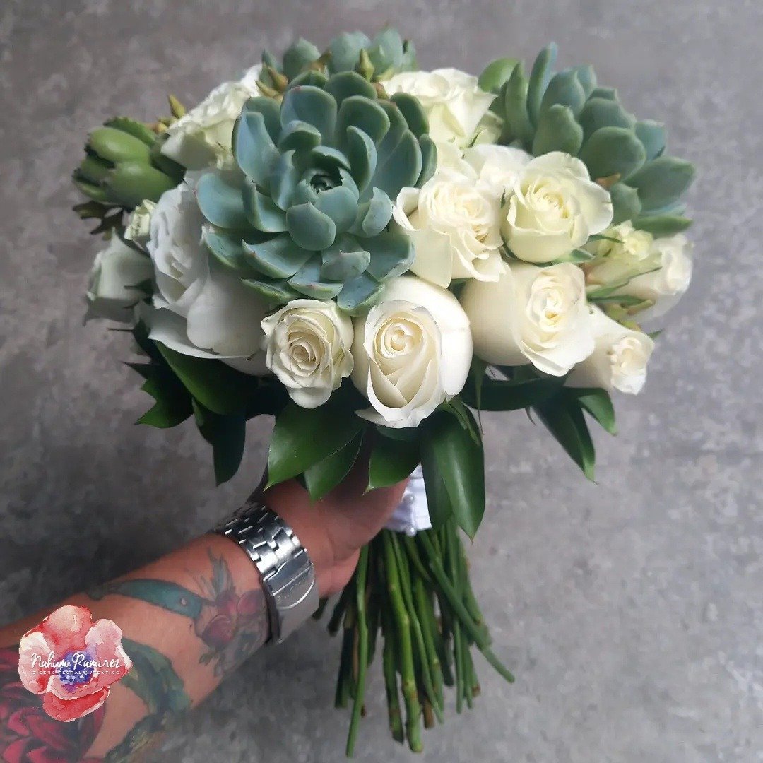 Ramo de novia con rosas blancas y suculentas verdes. Envíos CDMX y Área Metropolitana. Bottoniere del novio en cortesía.