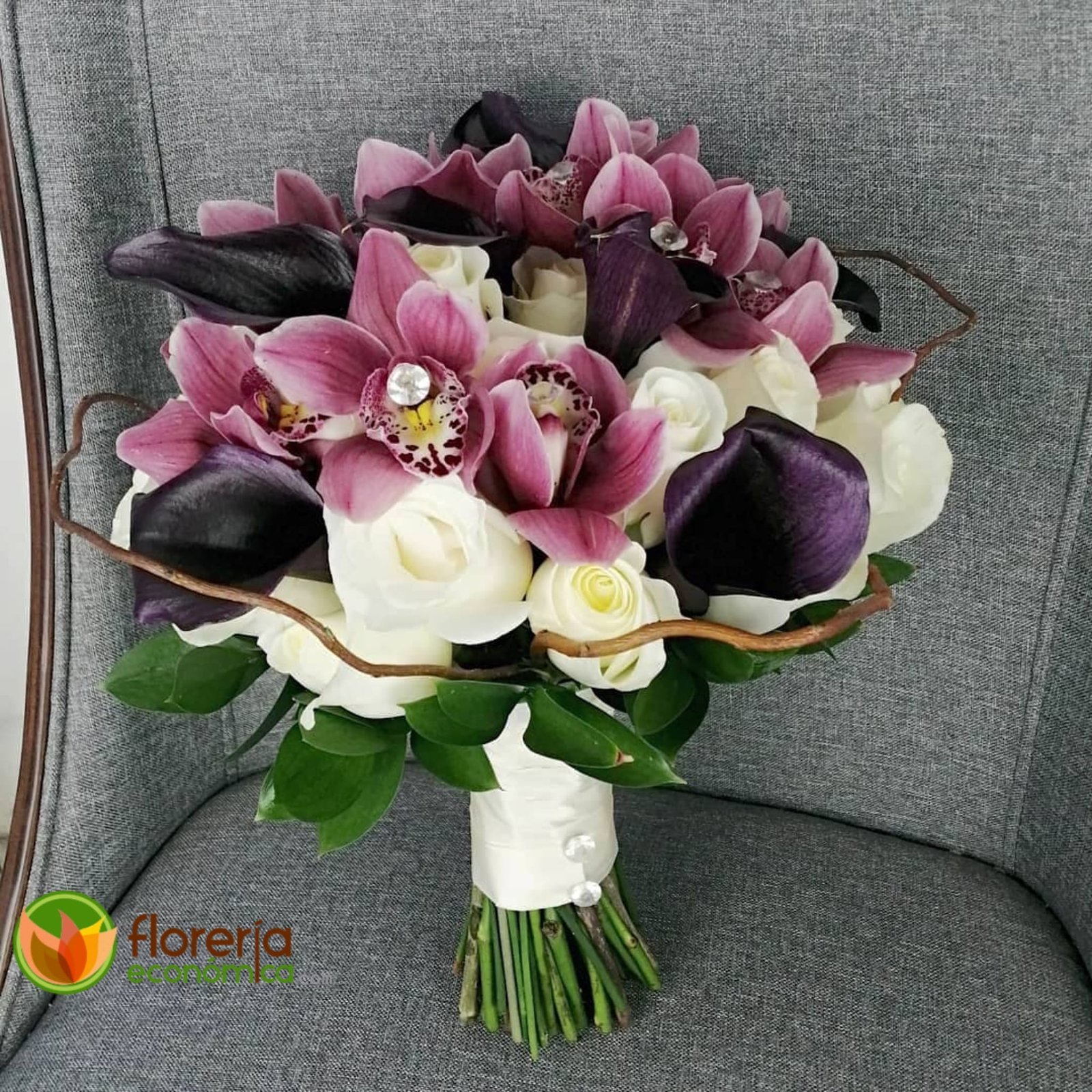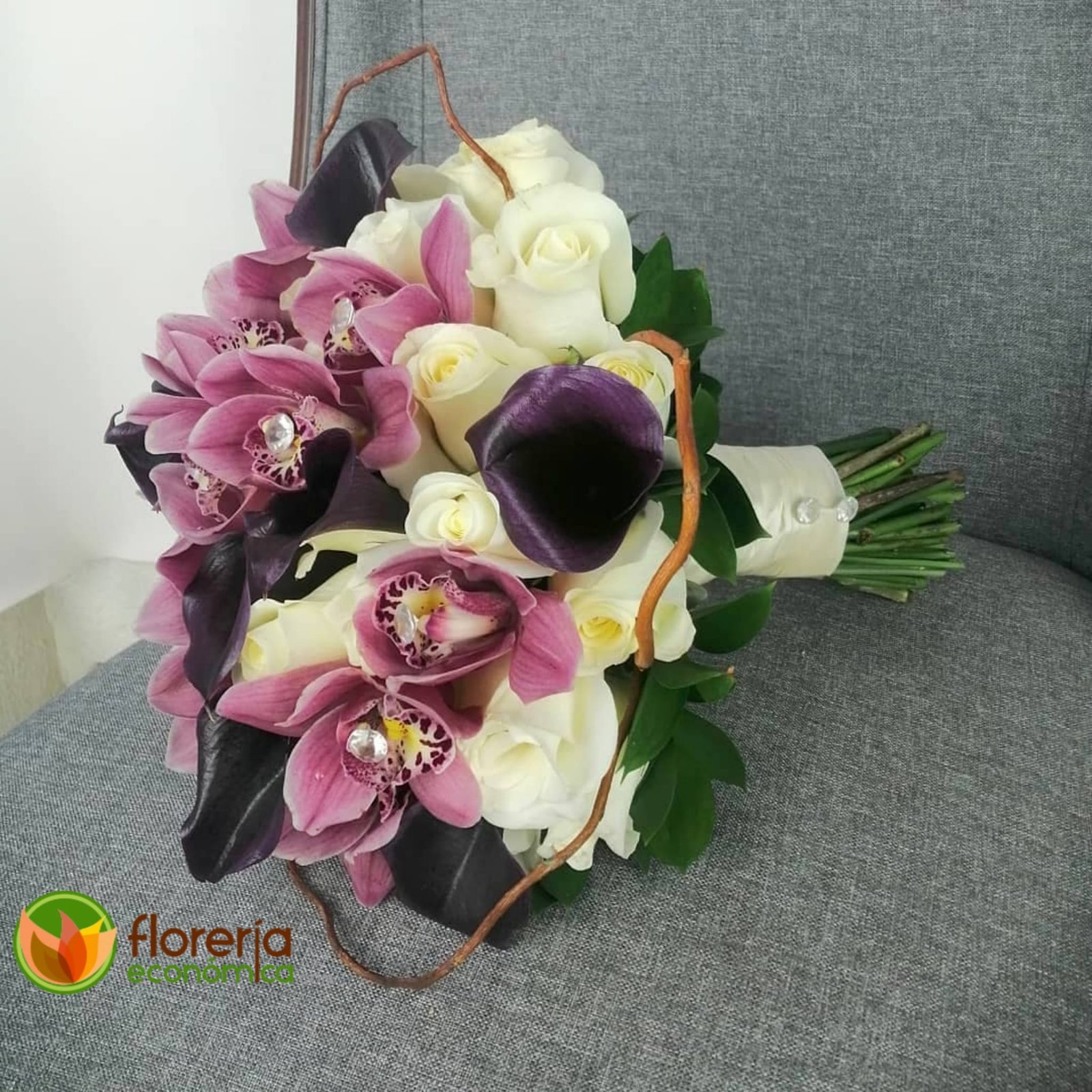 Ramo de novia con rosas, orquideas y calas moradas. Incluye bottoniere de orquídea. Te lo enviamos a tu casa con costo adicional.