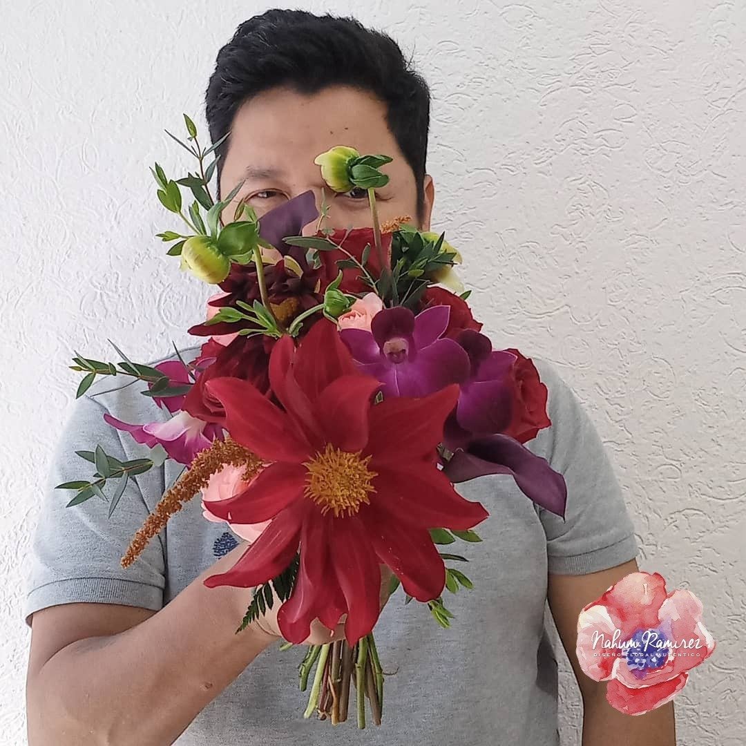 Ramo de novia natural con dalias, rosas rojas y orquideas dendrobium. Enviamos CDMX y Estado de México. Checar temporada