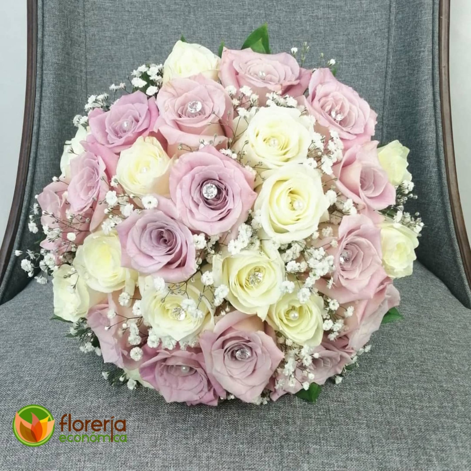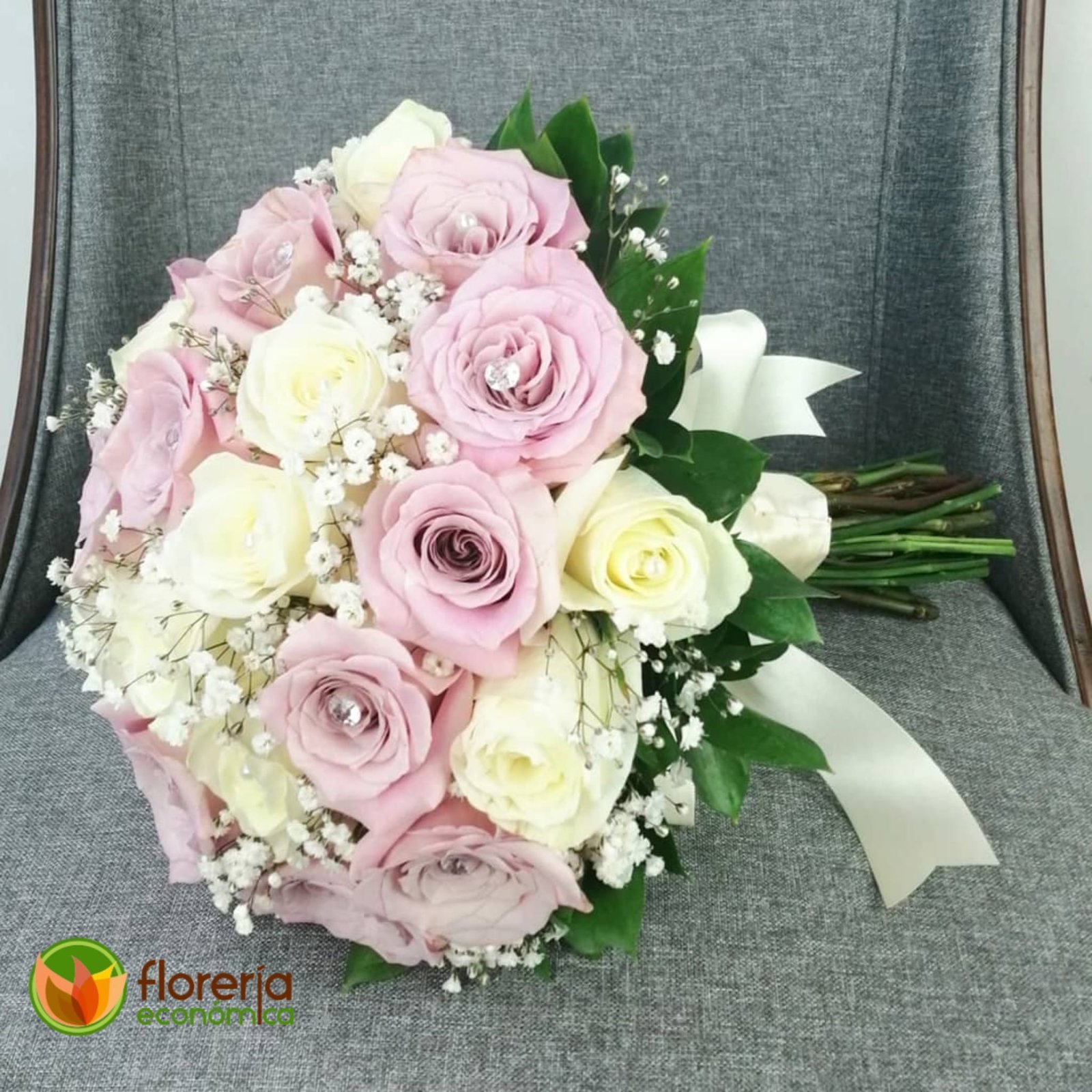 Ramo de novia con rosas en dos tonos, baby breath y pines decorativos. Pregunta por los paquetes y el envío hasta tu casa.