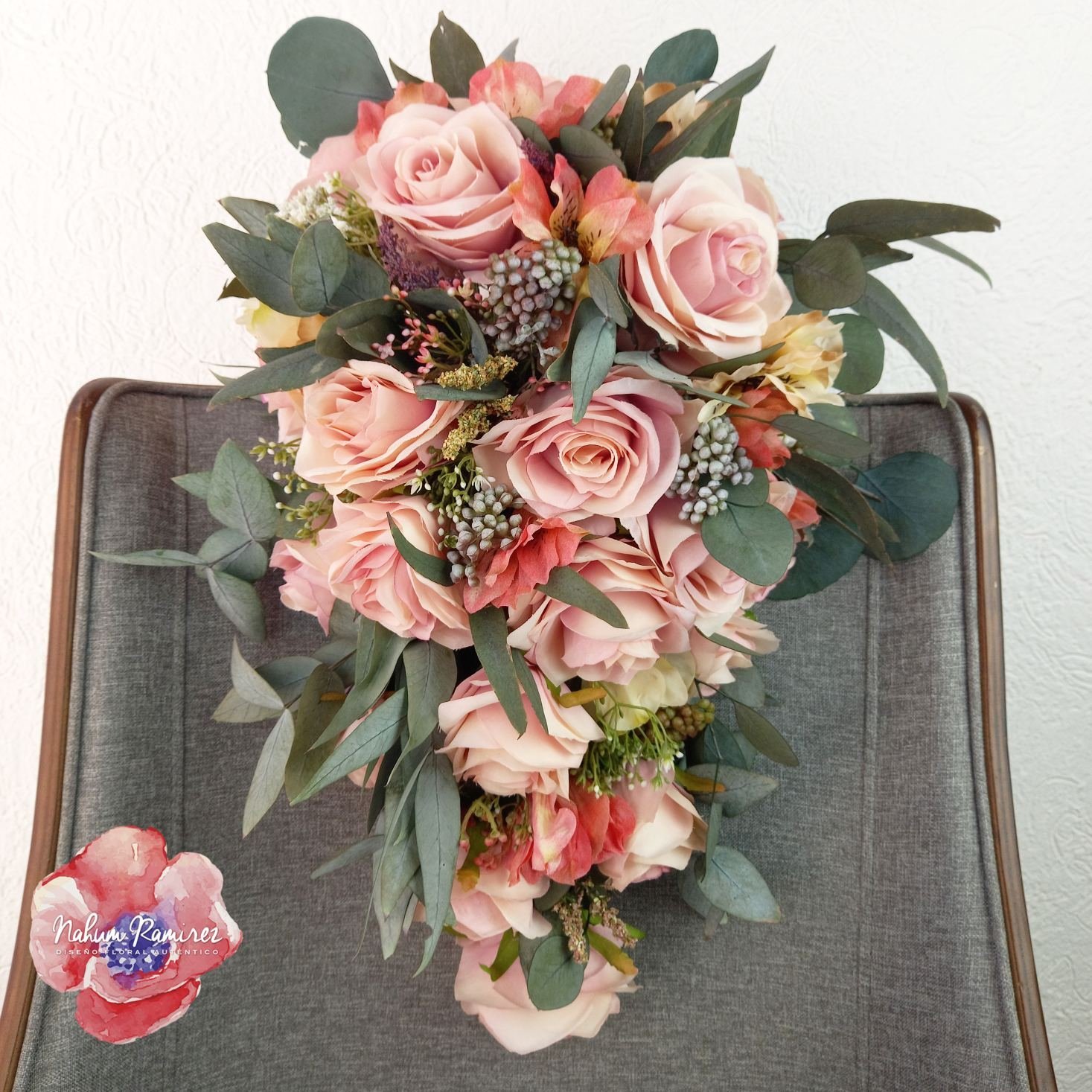 Ramo de novia artificial en cascada con rosas color melón y follaje rehidratado. Enviamos a toda la República.