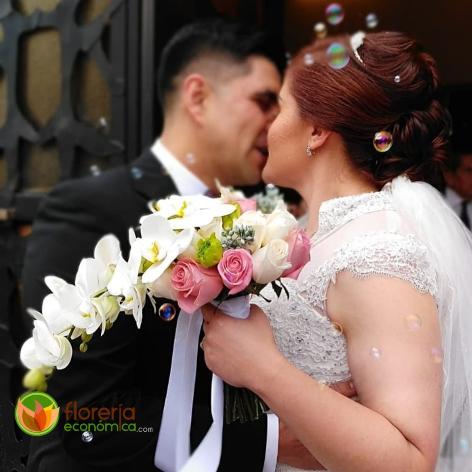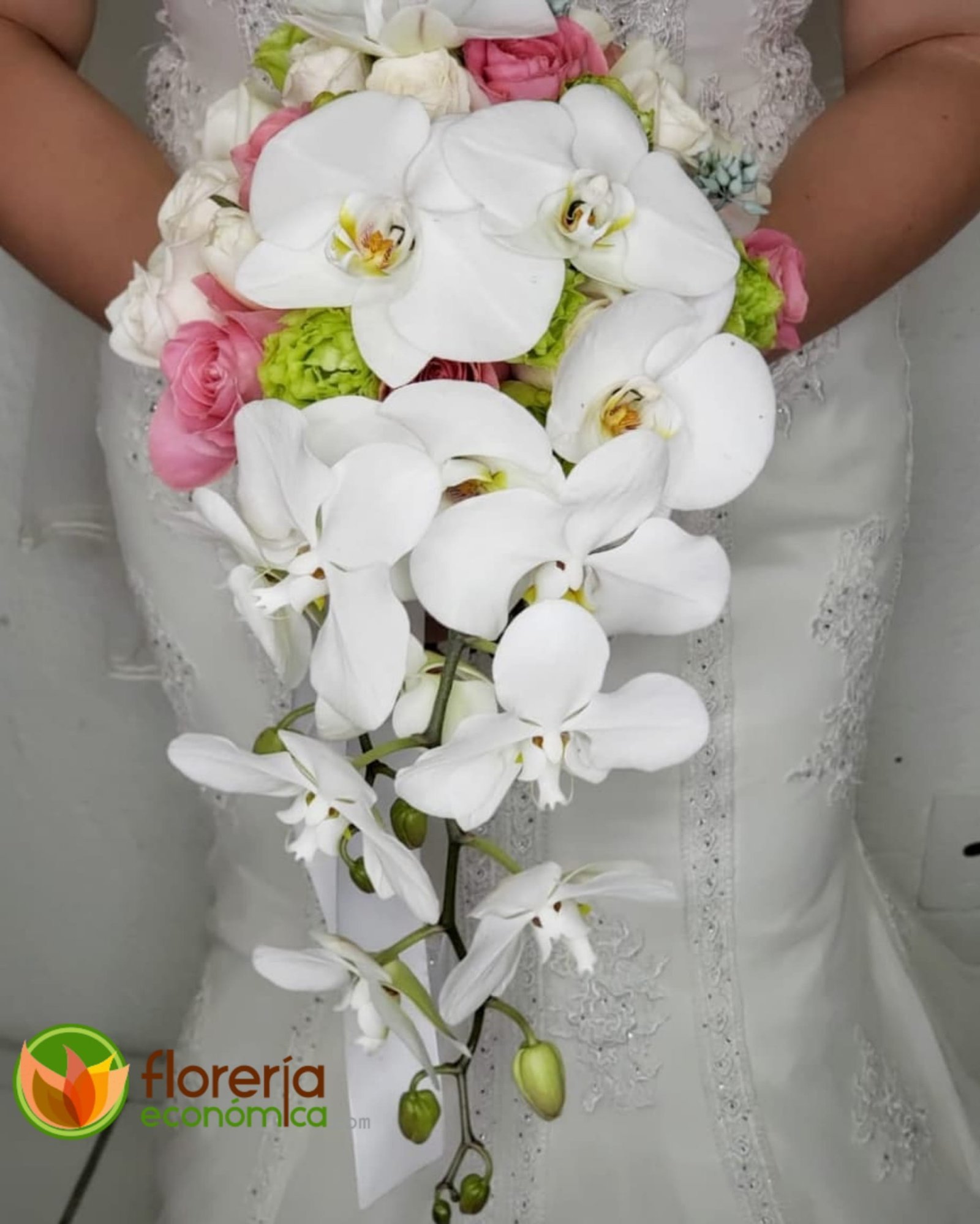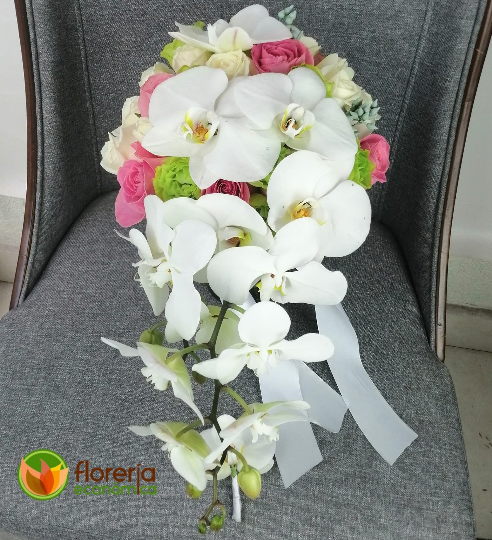 Ramo de novia en cascada con orquídeas phalaenopsis, lisianthus verde, tulipanes blancos y rosas en dos tonos. Super bello. Por $600 pesos más llévate el paquete con el ramo de aventar, el ramo de la virgen y el bottoniere del novio.