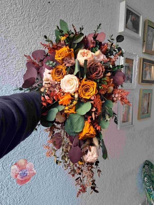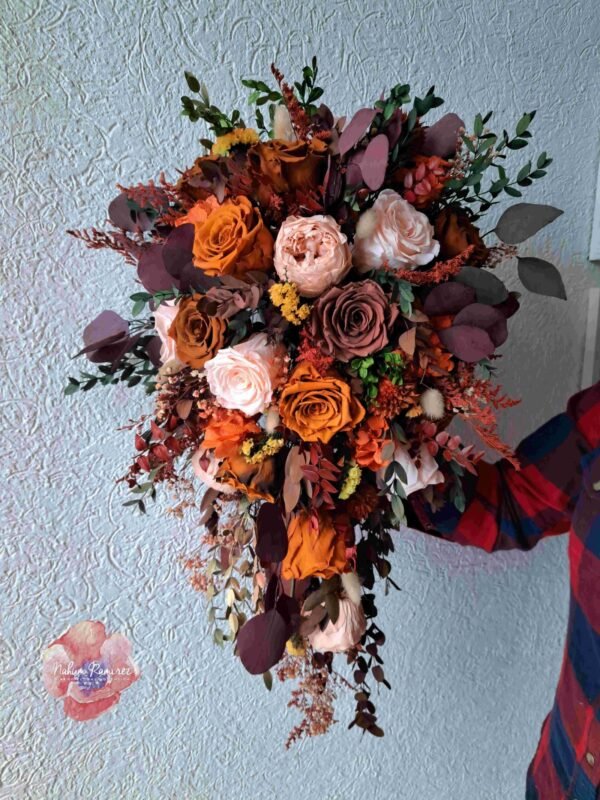 Ramo de novia preservado en cascada estilo otoñal. Envíos a toda la República y Estados Unidos.
