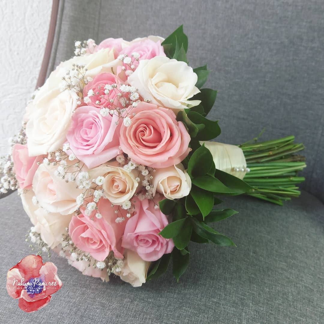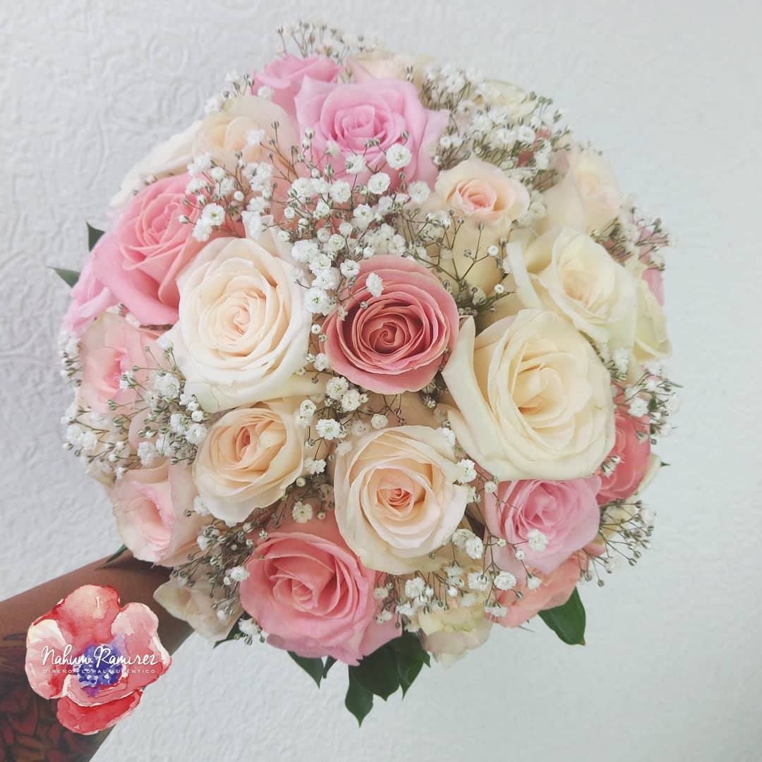 Hermoso ramo de novia de puras rosas y baby breath en tonos rosas y ivory. Incluye bottoniere del novio. Enviamos a CDMX y  área metropolitana con costo adicional.