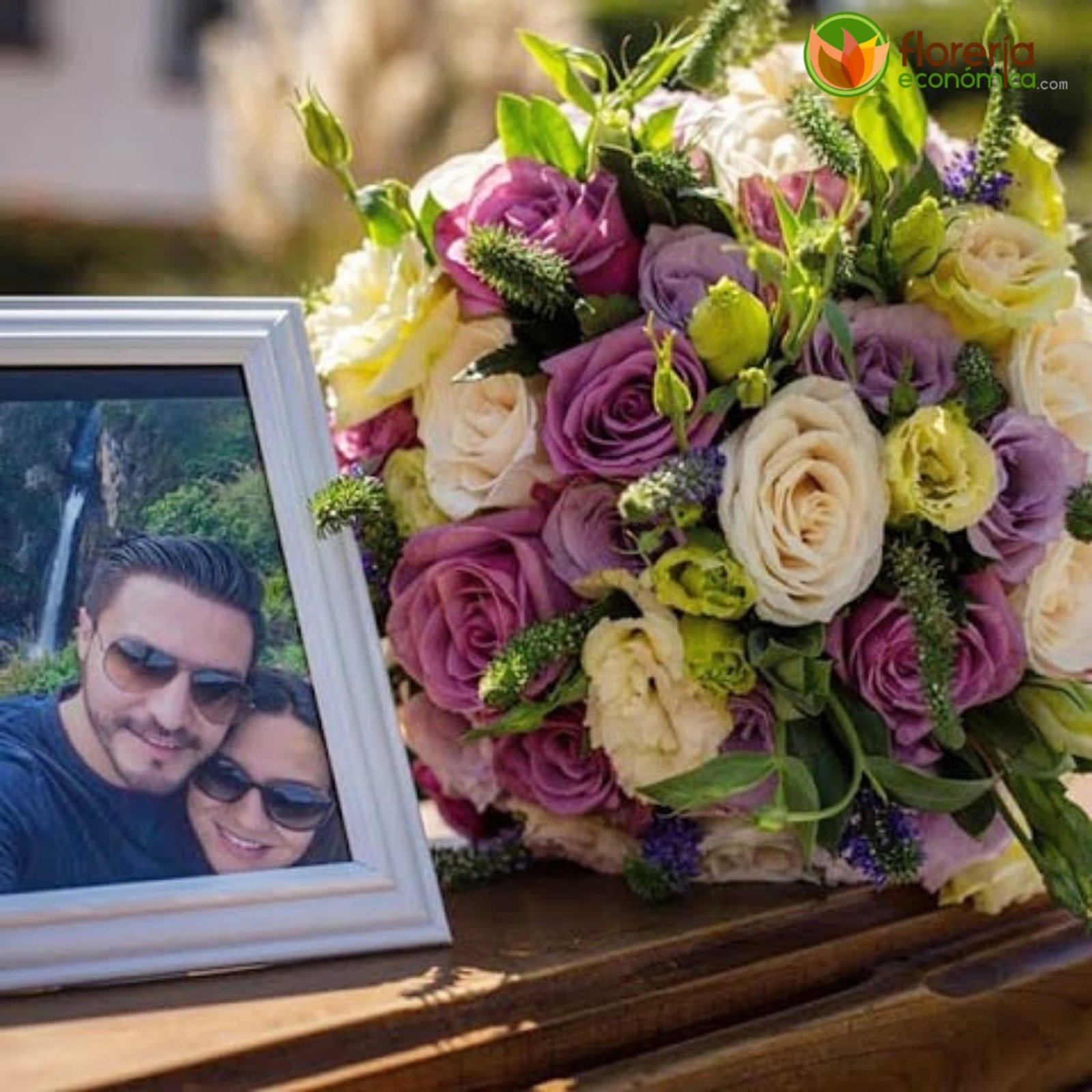 Ramo de novia con rosas color ivory, lisianthus lila y blanco y veronicas moradas. Te lo enviamos el día de tu boda a tu casa con costo adicional.