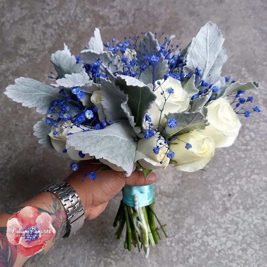 Hermoso ramo de novia en blanco con toques azules. Enviamos a domicilio CDMX y Área Metropolitana. Pide una cotización para un paquete con el ramo de aventar, ramo de la virgen y bottoniere.