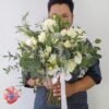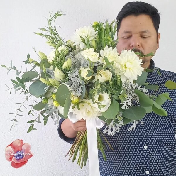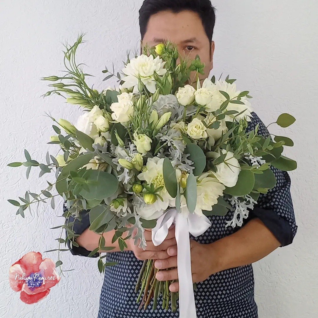 Ramo de novia natural en blanco con follajes de eucalipto, dalias, rosas, minirosas y lisianthus. Arma tu paquete con el ramo de aventar, el ramo de la virgen y el bottoniere.