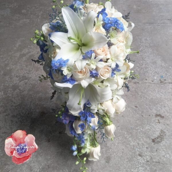 Ramo de novia en cascada en blanco, azul y ivory. Enviamos CDMX y Área metropolitana. El costo del envío es adicional.