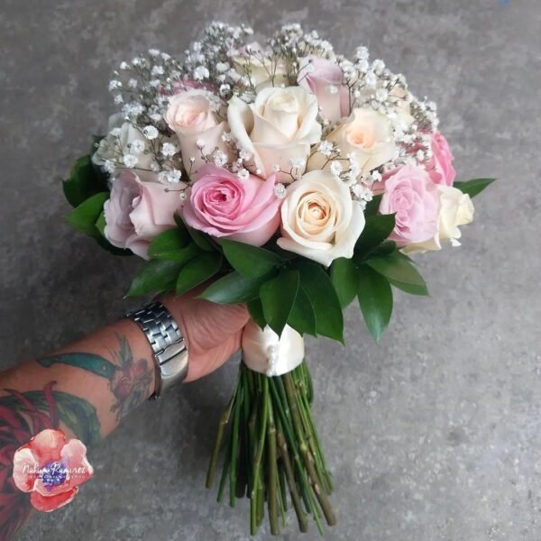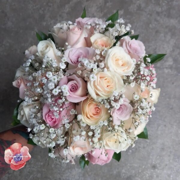 Hermoso ramo de novia en tonos muy suaves: durazno, rosa claro y ivory. Hacemos erntregas en la cdmx y área metropolitana.