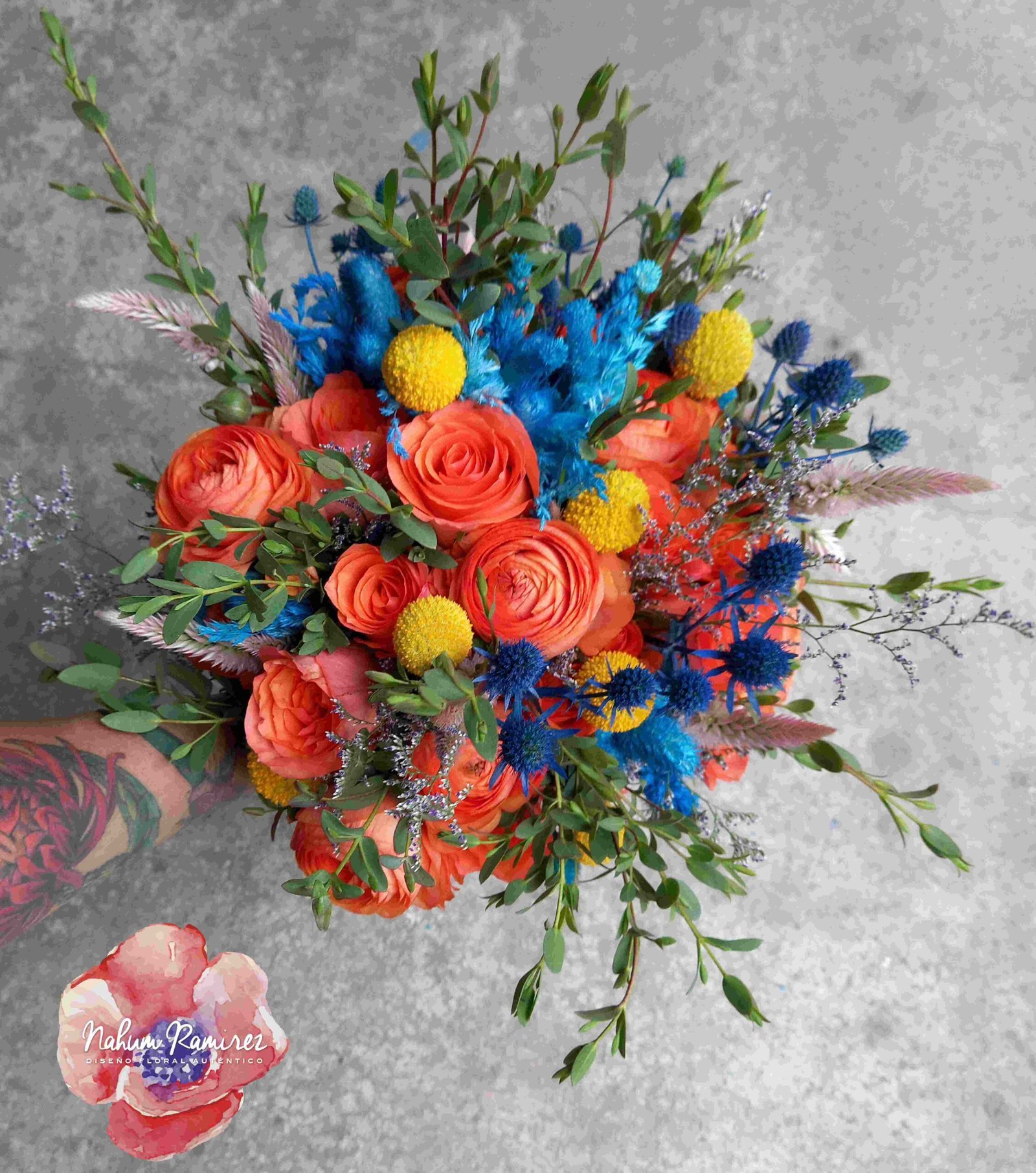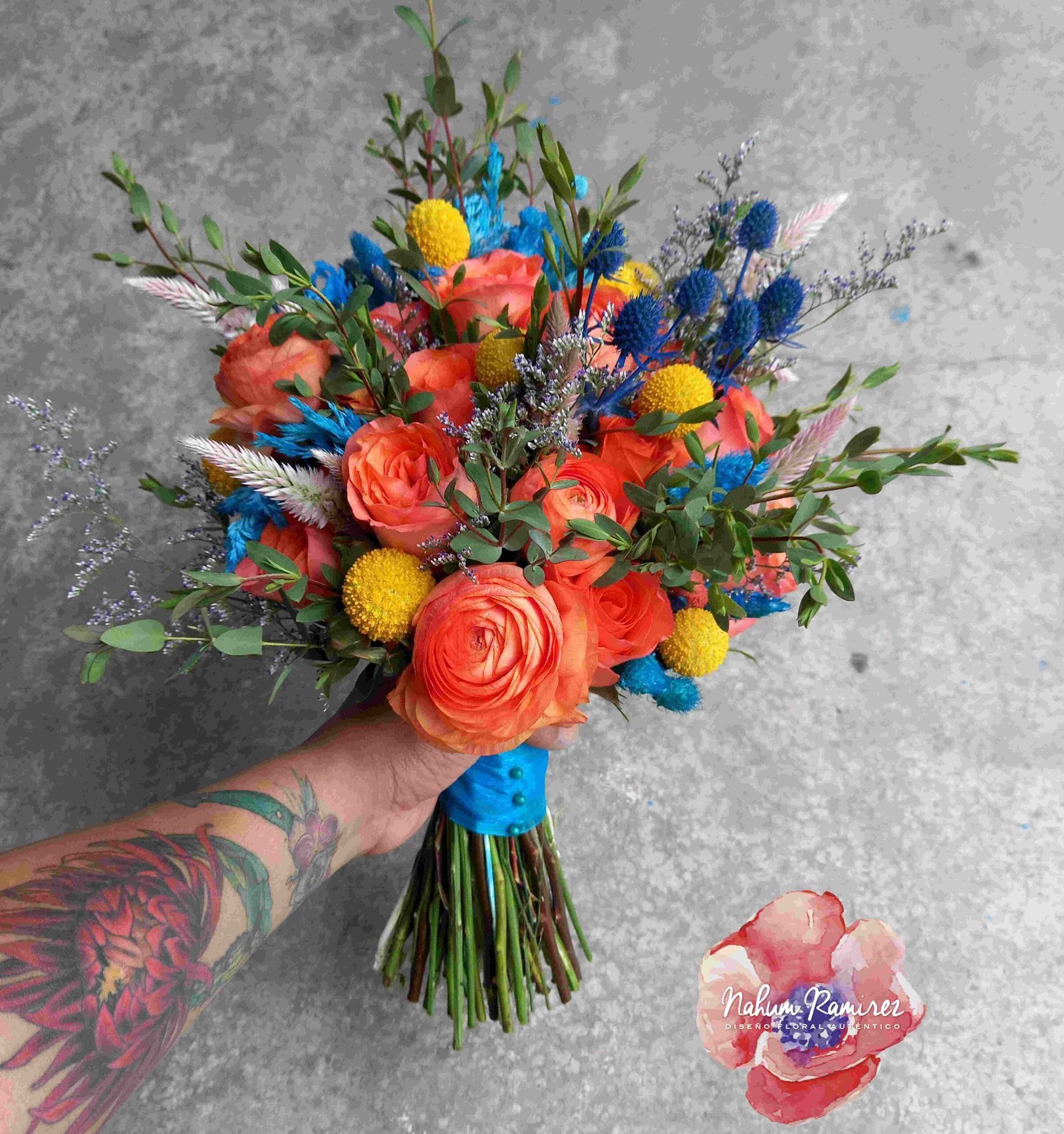 Ramo de novia natural naranja y azul turquesa