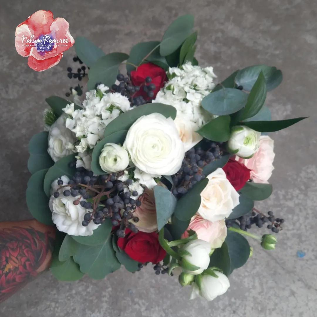 Ramo de novia natural con rosas, ranúnculus blanco. Estilo silvestre. Arma tu paquete con el ramo de aventar, el ramo de la iglesia y el bottoniere.