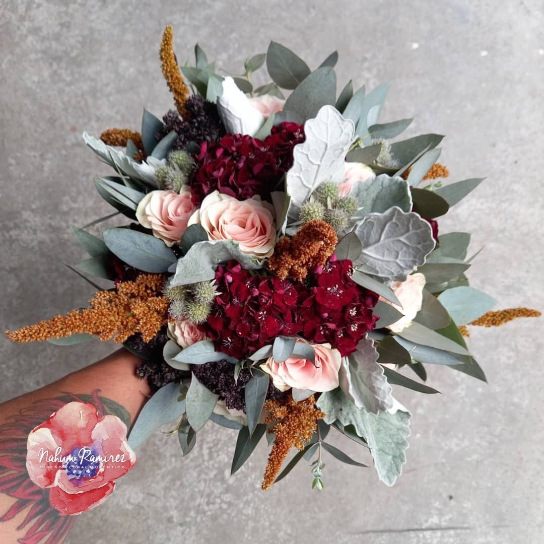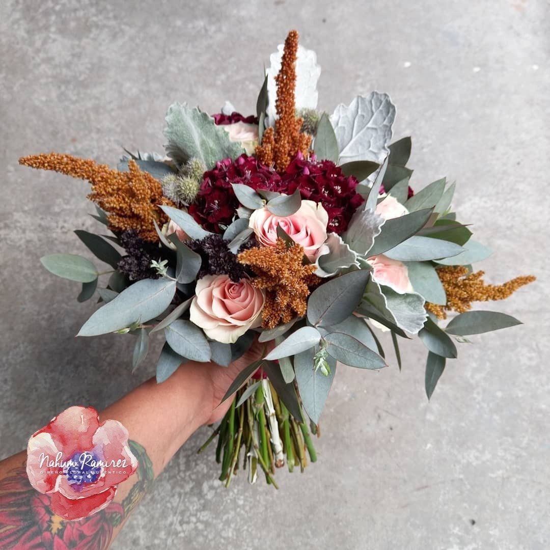 Este ramo de novia natural es ideal para bodas en jardines o haciendas. La armonía de color es rosa y vino. Entregamos a domicilio CDMX y Área Metropolitana. Por $600 pesos más te agregamos el ramo de aventar y el ramo de la virgen