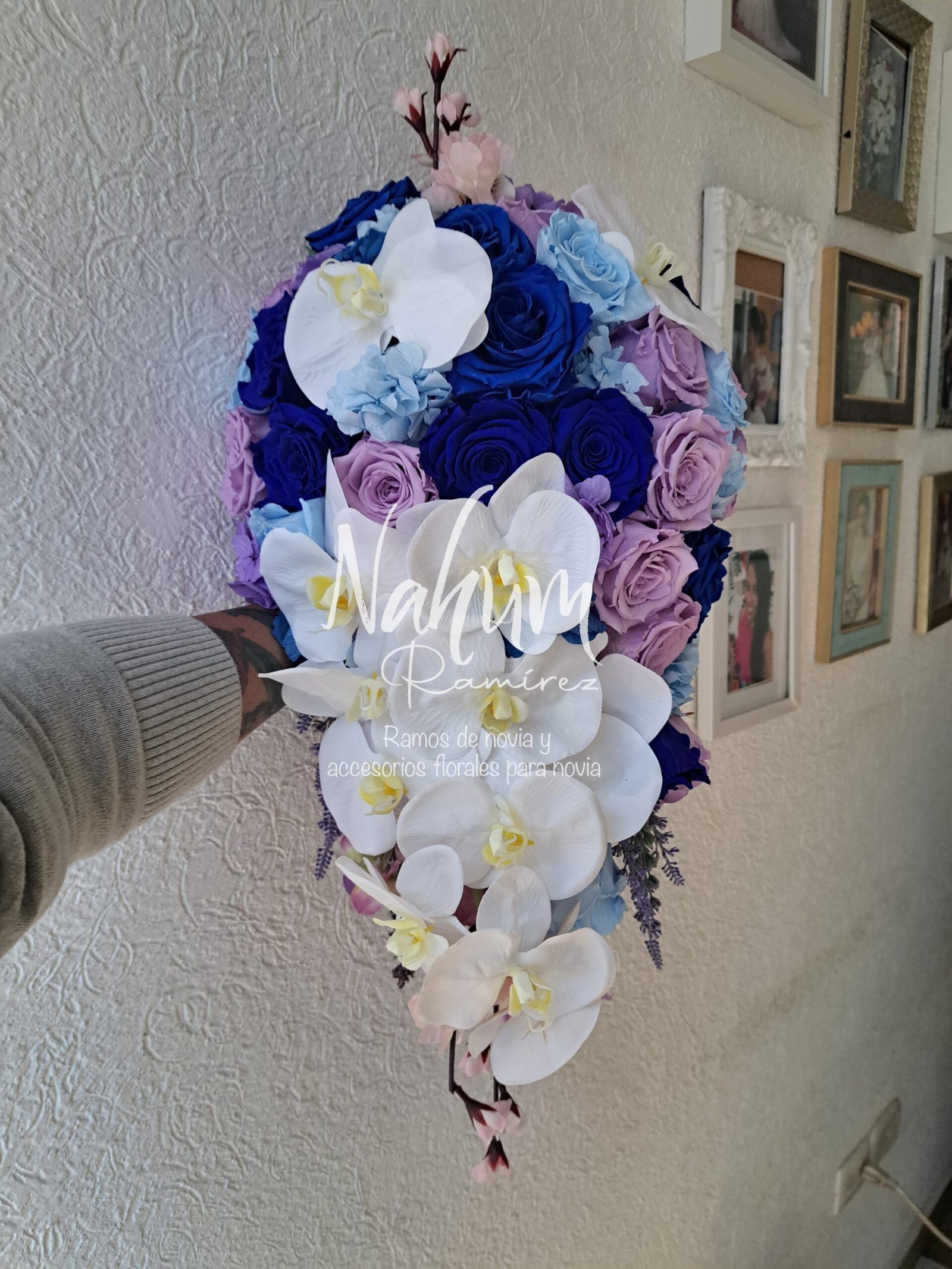 Ramo de novia preservado con rosas preservadas y orquideas artificiales