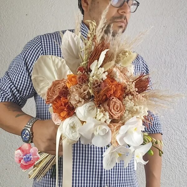 Ramo de novia preservado estilo boho en colores shedron.Algunas flores son artificiales.