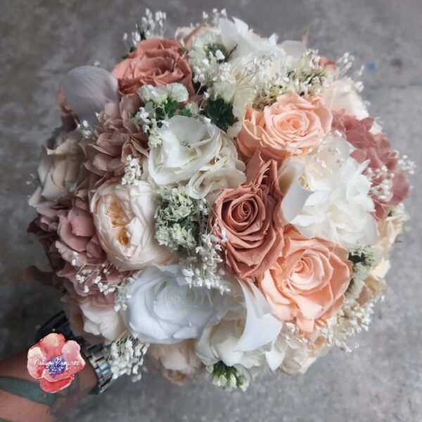 Hermoso ramo de novia en ivory y durazno. Envíos a toda la república.