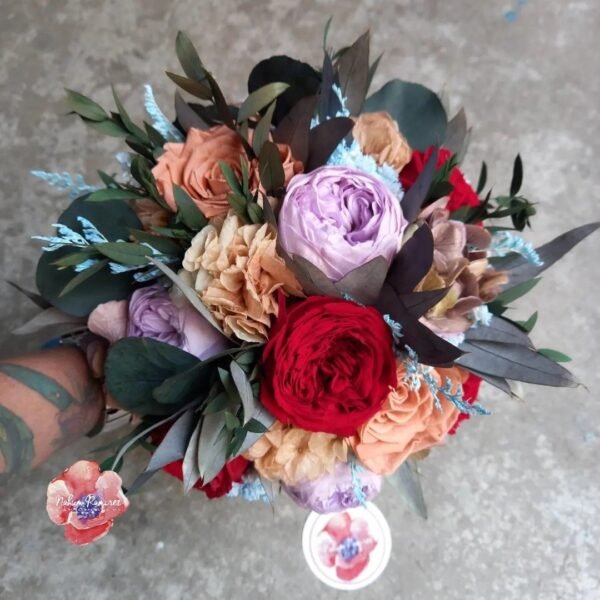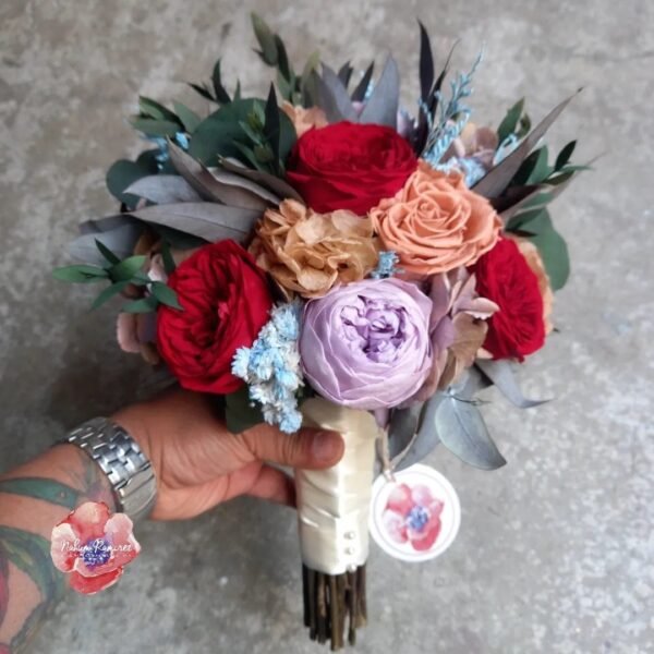 Ramo de novia preservado multicolor en rojo, lila y chocolate. Flores tipo peonias, hortensias, rosas y follaje de eucalipto