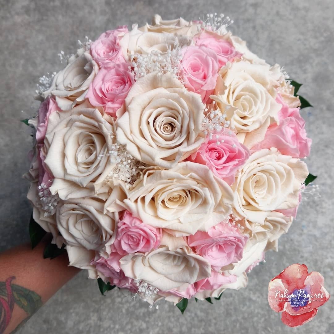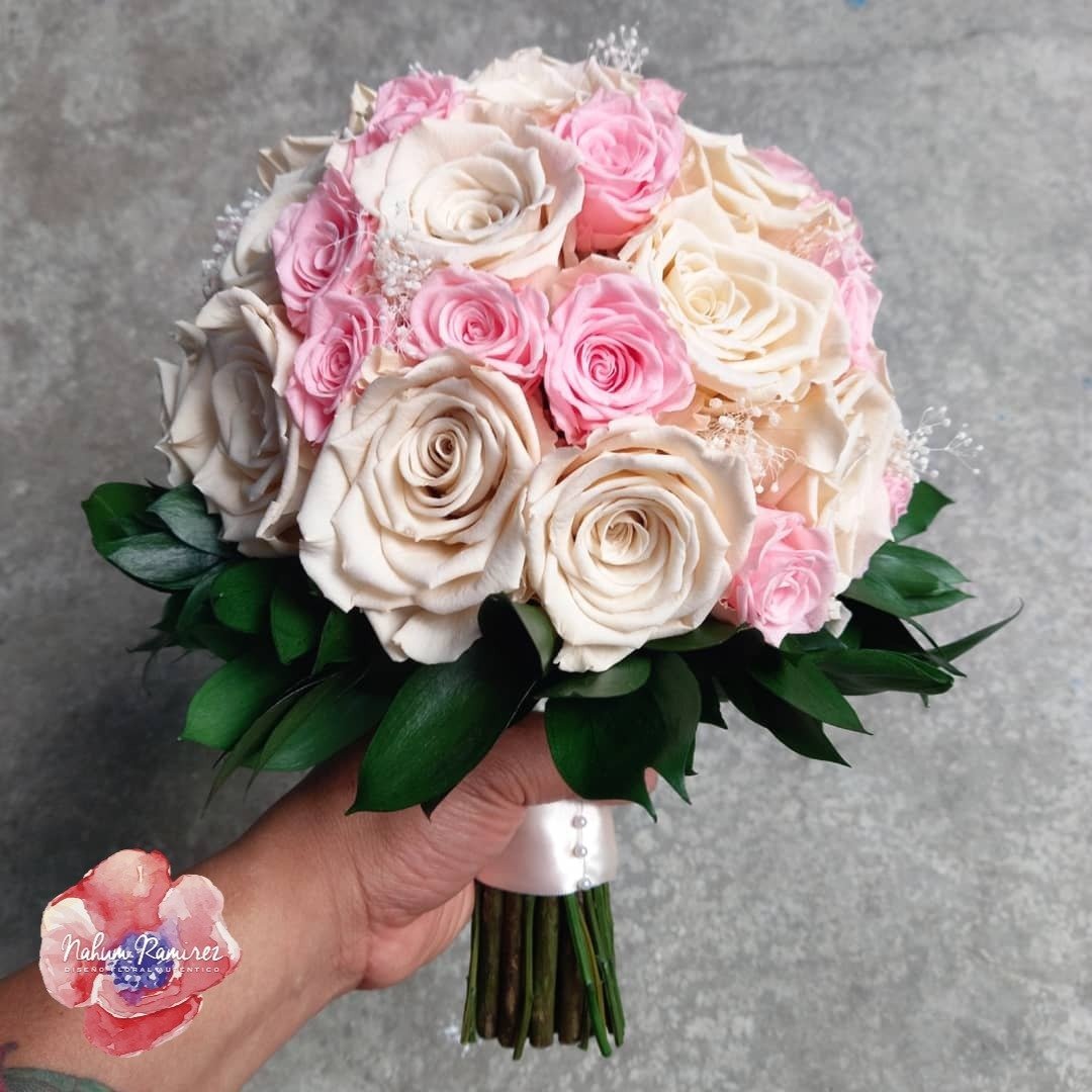 Ramo de novia rehidratado con rosas y minirosas en colores ivory y rosa. Incluye bottoniere. Hacemos envíos a toda la República
