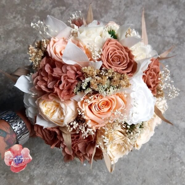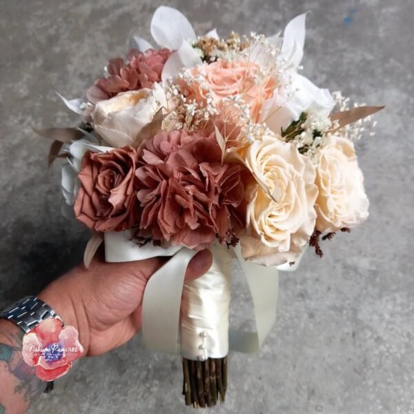Ramo de novia rehidratado en tonos ivory, durazno y café. Envíos a toda la República.
