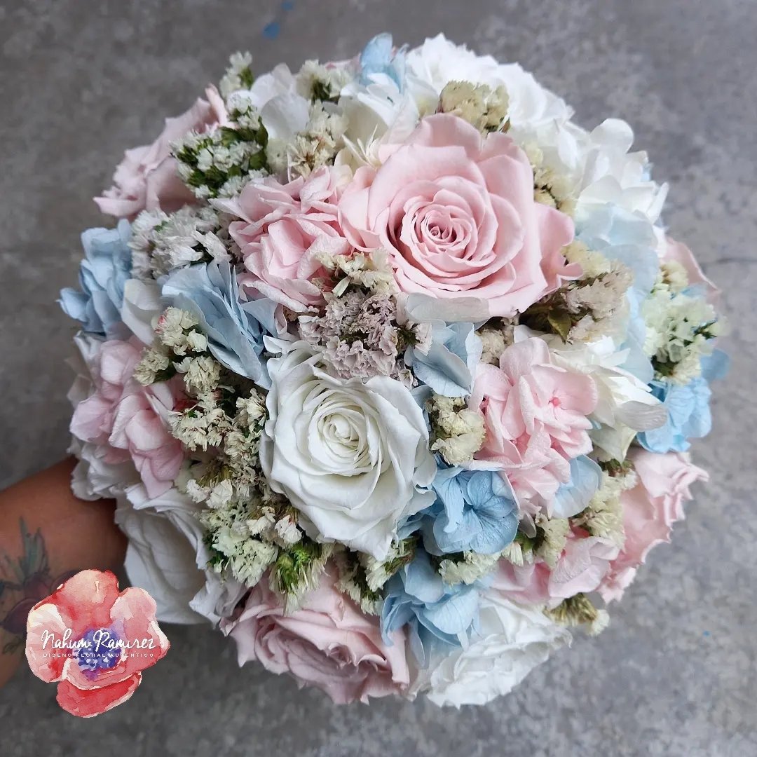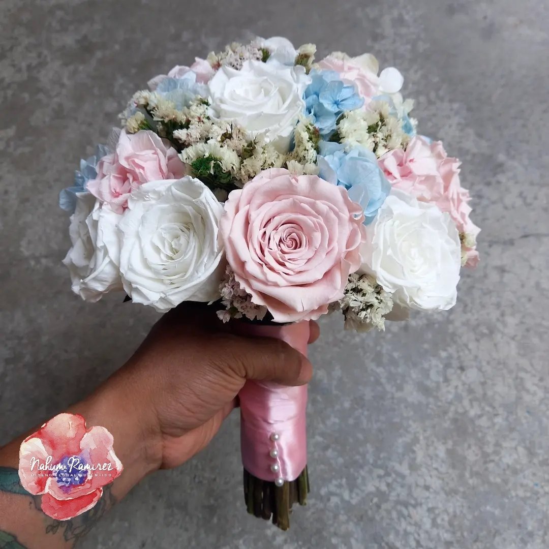 Hermoso ramo de novia en tonos rosas y toques de azul. Envíos a toda la República.
