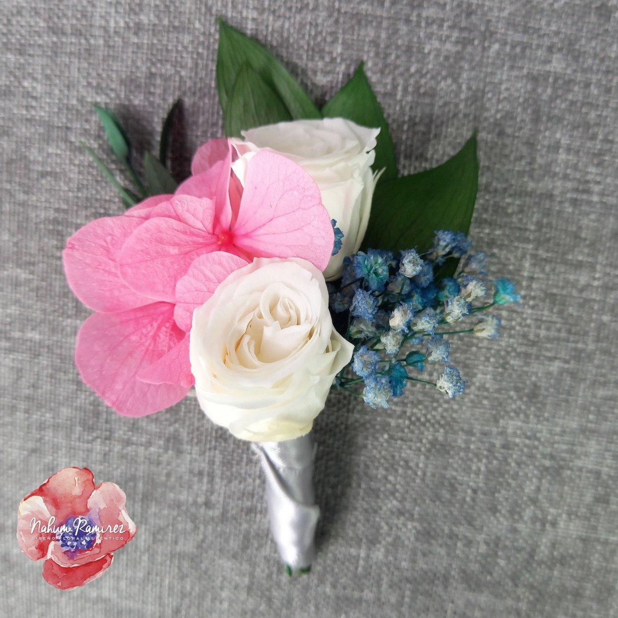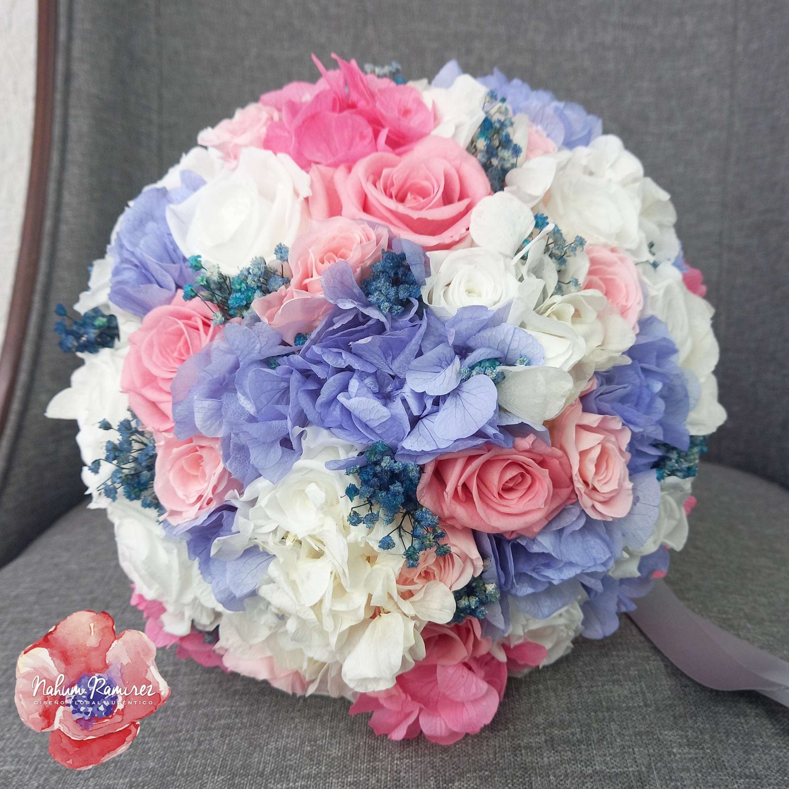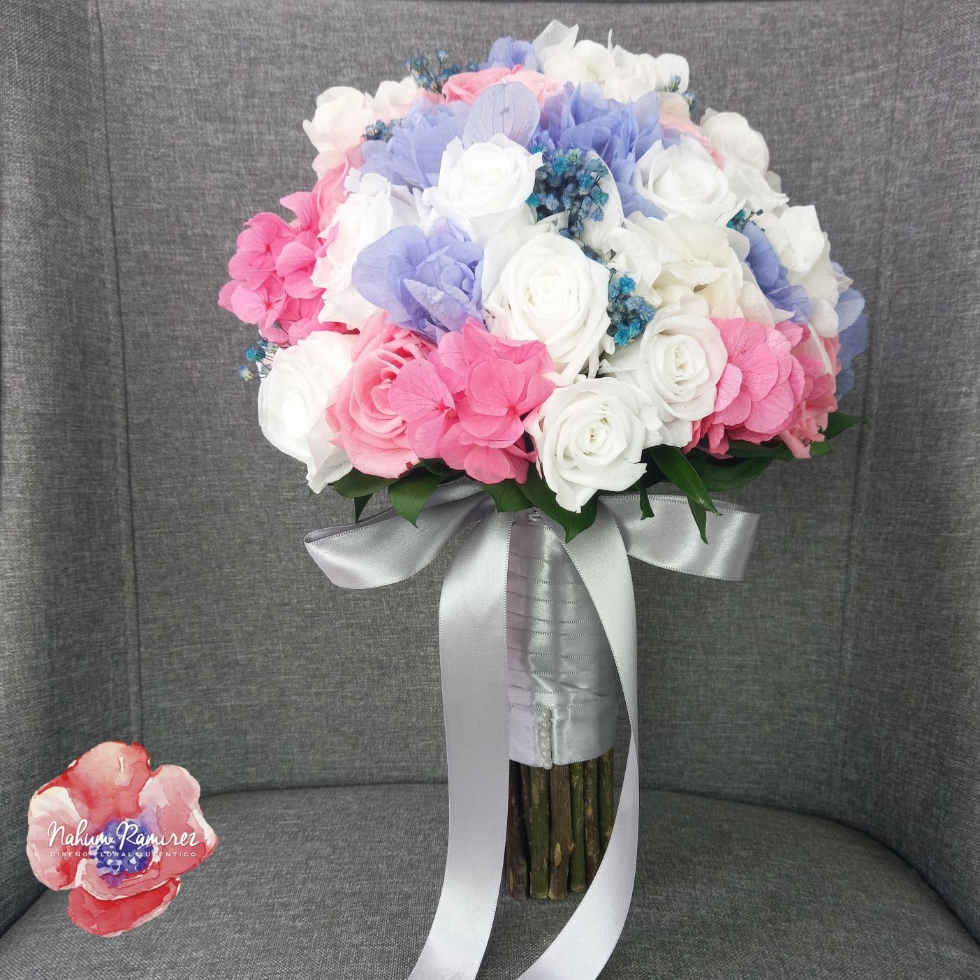 Hermoso ramo de novia rehidratado en colores rosa, blanco y azul. Lleva un listón plateado. Enviamos a toda la República.