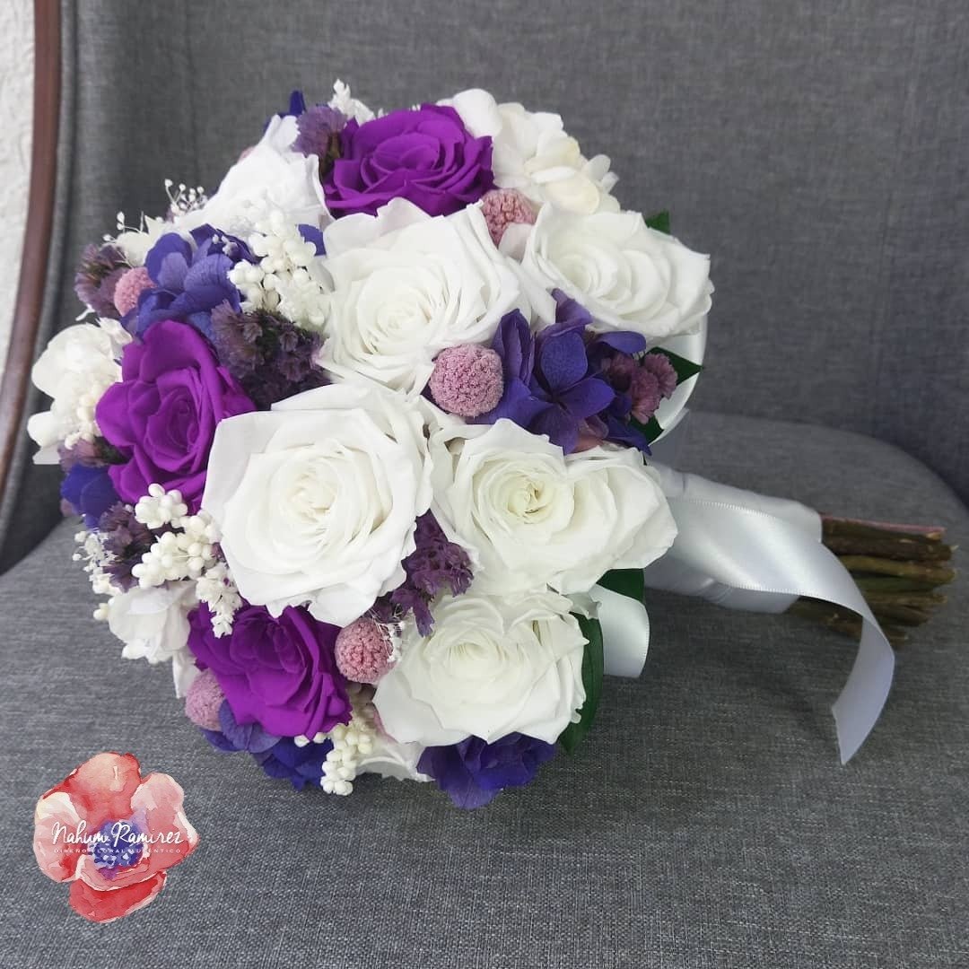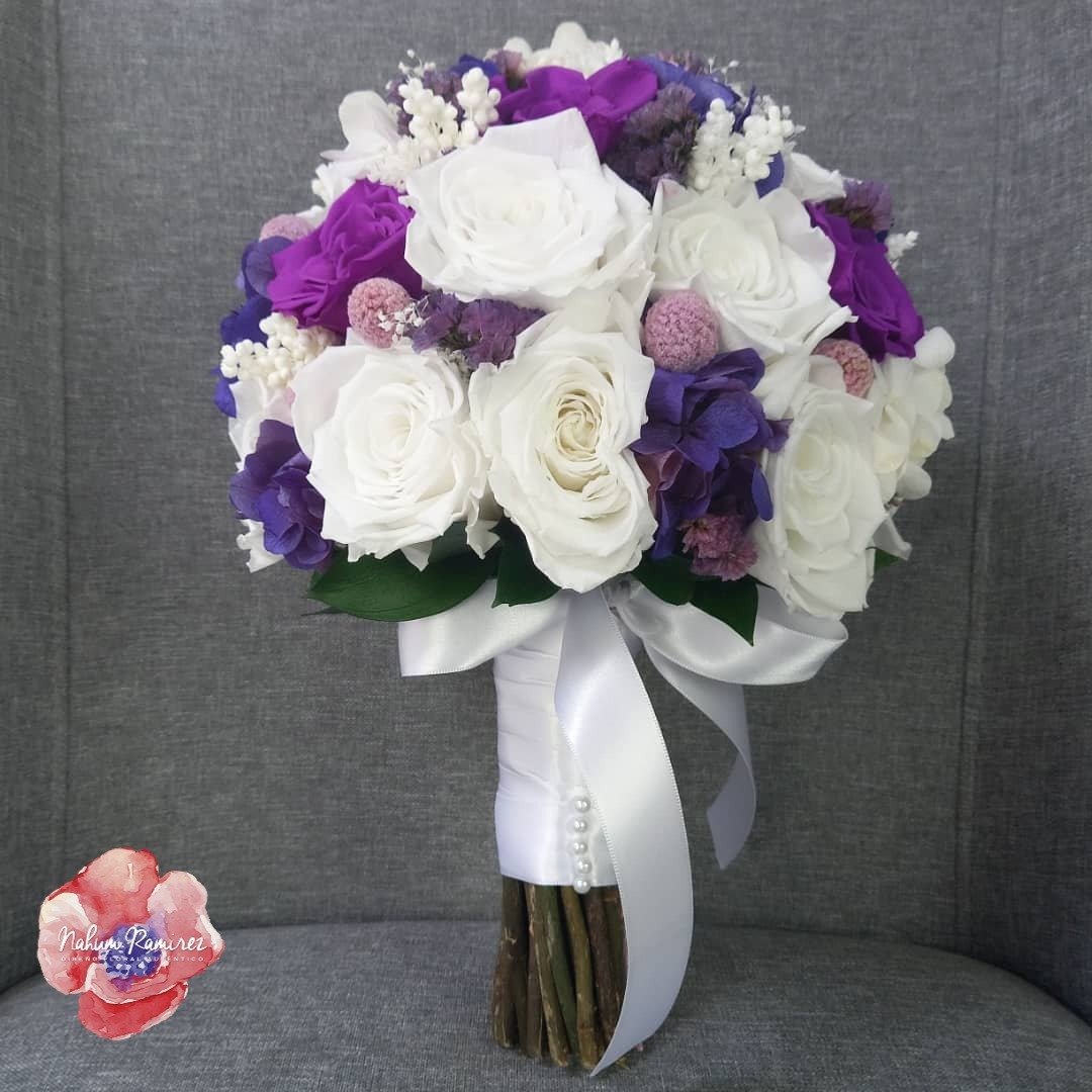 Ramo de novia 100% rehidratado con flores de importación en blanco, morado y lila. Envíamos a toda la República.